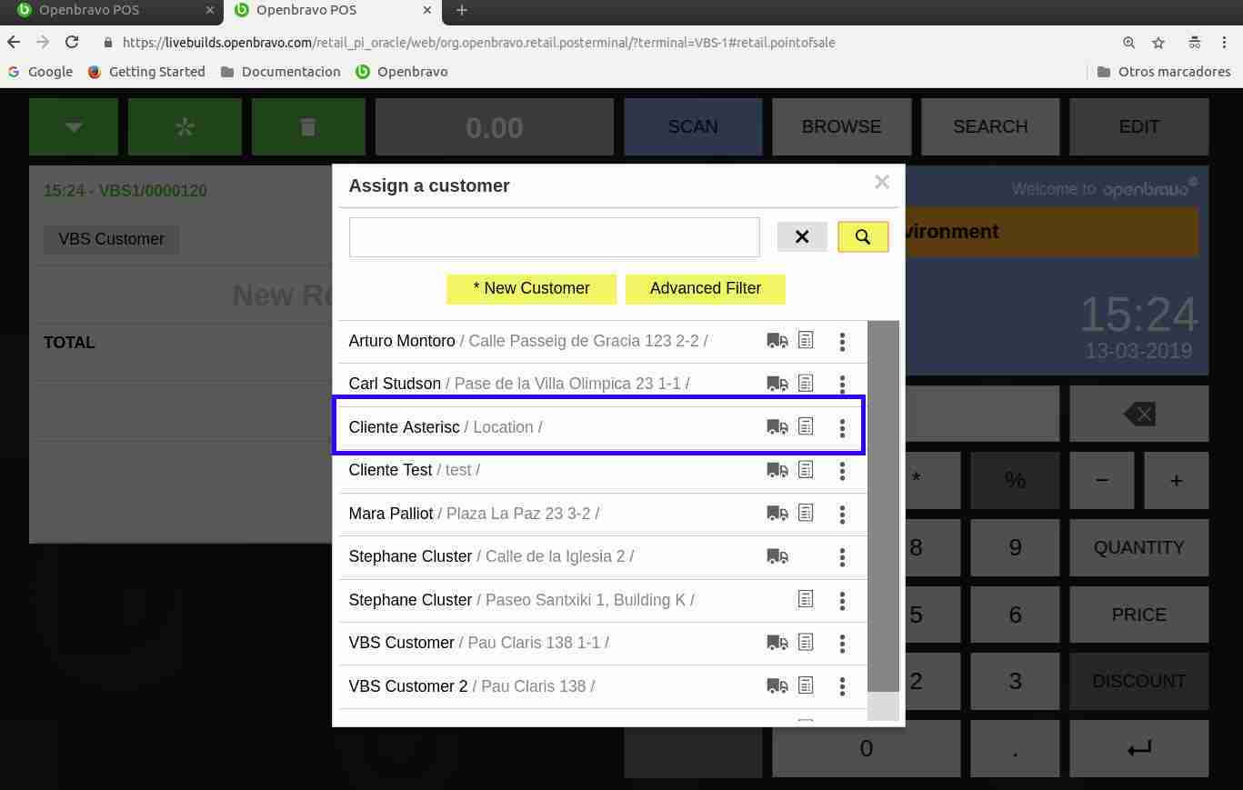 | Steps To Reproduce | Go to Business Partner window and create a new customer for * Organization named "Cliente Asterisc". Configure it as follow: Customer = Yes Payment Method = Cash Invoice Terms = Immediate Enter a Location and Contact info. Go to Web POS and log in by using terminal VBS-1 that belongs to Vall Blanca Organization. Realize that it is not possible to select this new customer in a ticket. Go back to Business Partner window and select a sales price list for the customer different than the one assigned to Vall Blanca Store (that is White Valley Group Product List), for instance "Sales Price List Customer". Go to Web POS and refresh. Veriy that now Cliente Asteric is shown. See image attached. | |||||||||||