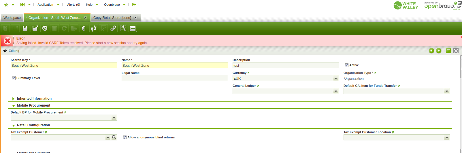 | Steps To Reproduce | 0) Use an environment with the Retail pack + Copy Store module 1) Login as White Valley Group Admin 2) Open the [Organization] window 3) Open the "Copy Retail Store" process and execute it 4) Go back to the [Organization] window and try to edit a record. Note that is not possible because of the CSRF Token Error (see attached image) | |||||||
