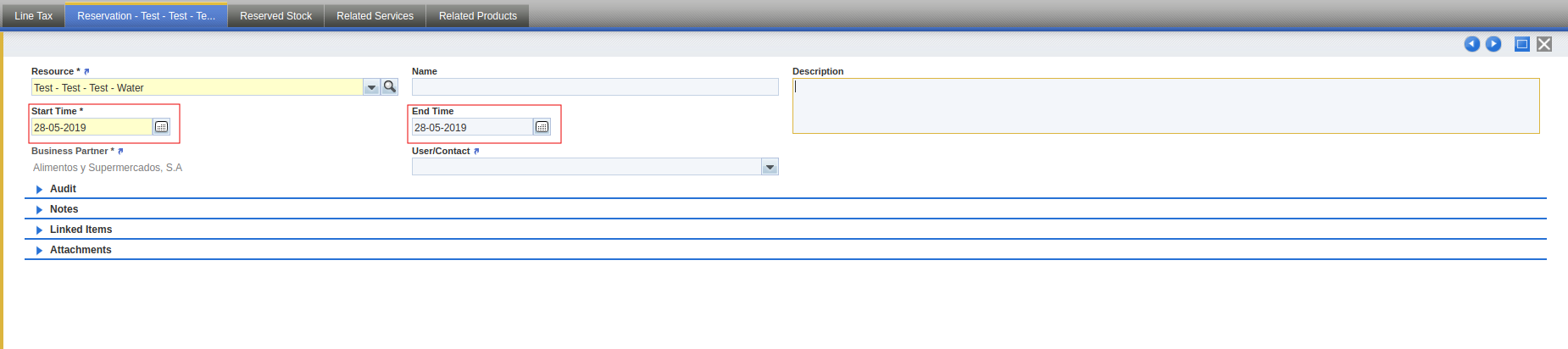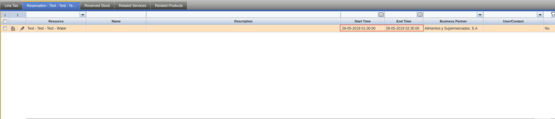 3. Go to the [Sales Order] window, select a line of the newly created order, switch into the "Reservation" subtab to see that the "Start Time" and "End Time" fields show different information in grid and form.