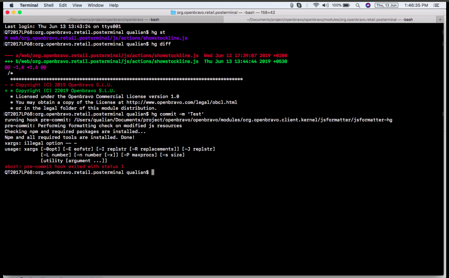 Repository: erp/devel/pi Changeset: a56212b85ebdfd89cf1a8b6e8509c9f832c1a9c8 Author: Javier Armendáriz <javier.armendariz <at> openbravo.com> Date: Fri Jun 14 09:26:03 2019 +0200 URL: http://code.openbravo.com/erp/devel/pi/rev/a56212b85ebdfd89cf1a8b6e8509c9f832c1a9c8 [^] Fixed issue 41094: Improved support for OSX There are parts of the script that, although correct in linux, uses options that are not supported on OSX: * xargs --max-args is not present on OSX, replaced by -n * find -printf is not present on BSD/OSX, for our purpose it can be replaced by executing dirname --- M modules/org.openbravo.client.kernel/jsformatter/jsformatter M modules/org.openbravo.client.kernel/jsformatter/jsformatter-hg-hook M modules/org.openbravo.client.kernel/jslint/jslint M modules/org.openbravo.client.kernel/jslint/jslint-hg-hook M modules/org.openbravo.client.kernel/jsutils/dir-functions --- |