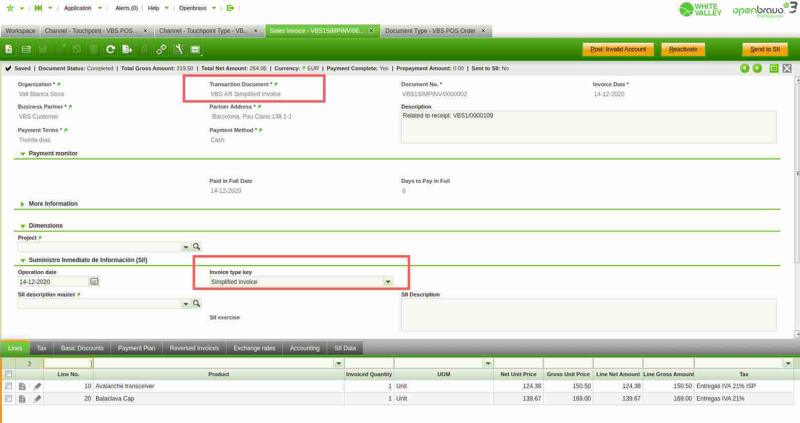 This configuration will create a sales invoice with the value "VBS AR Simplified Invoice" in the field "Transaction Document" (Document Type for Simplified Invoices, in the backoffice).