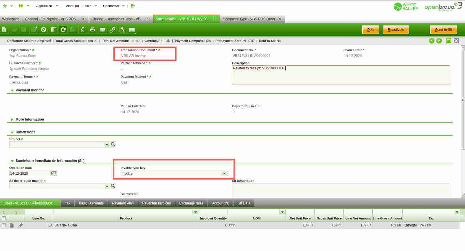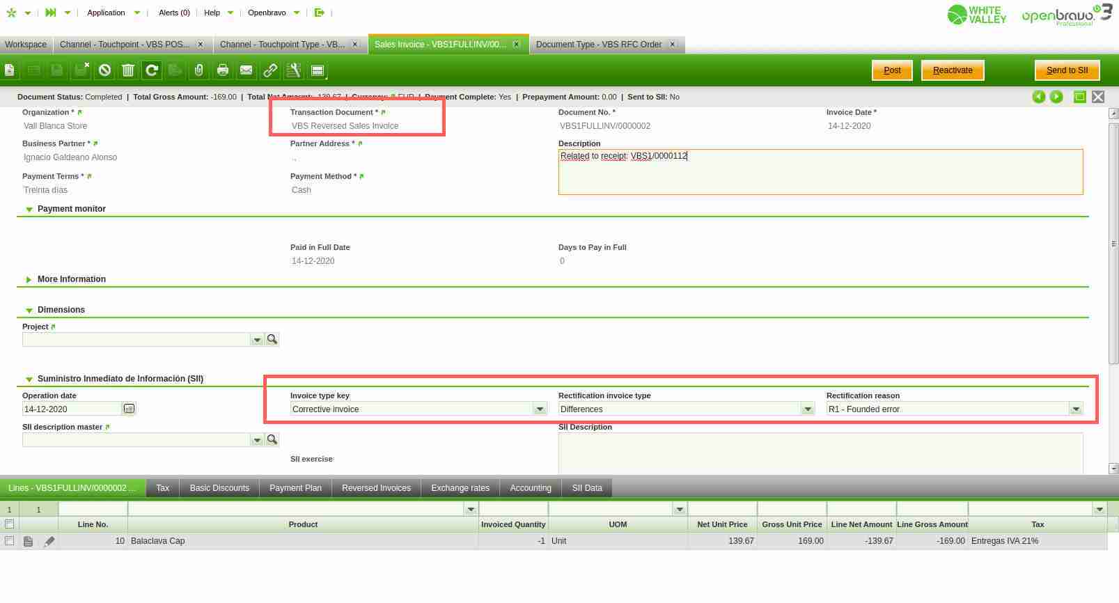 In such cases a full return invoice is created in the Openbravo backoffice (Sales Invoice window) as described below: