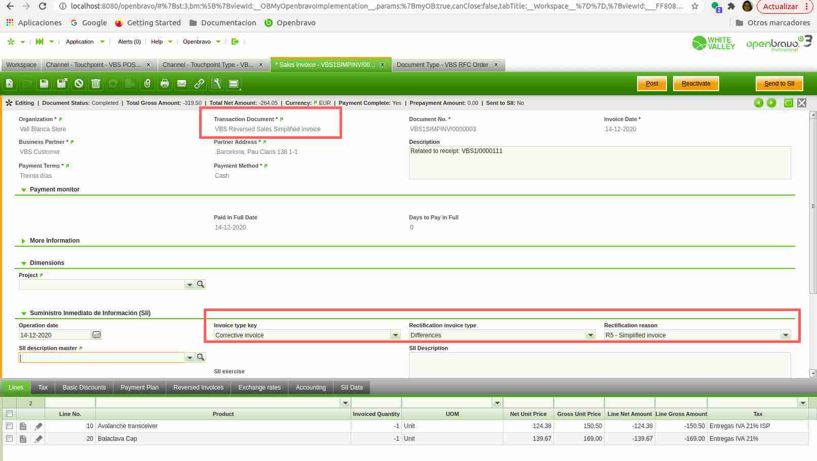 In such cases a simplified return invoice is created in the Openbravo backoffice (Sales Invoice window) as described below: