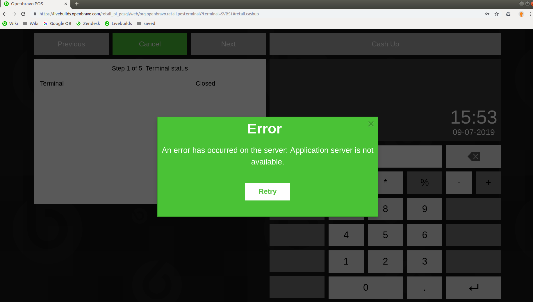 | Description | Maybe the shown error code “Application server is not available” when trying to do a cash up offline with terminal hierarchy is not very specific, it talks about availability of the server when the problem is that you cannot do a cash up offline with terminal hierarchy as explained here: http://wiki.openbravo.com/wiki/Retail:Web_POS_User_Guide#Shared_Payment_Devices [^] (2nd paragraph of that section) | |||||||||||