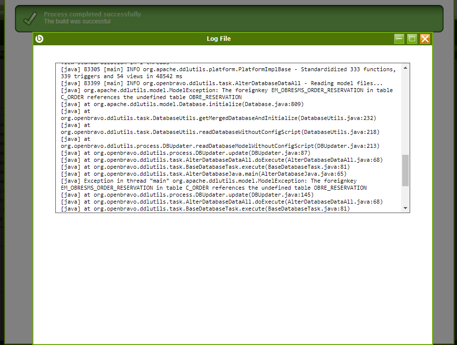 Launching the Rebuild process, it finishes (or seems to finish) successfully, since a green banner "Process Completed Successfully" is shown. But looking at the log shows a different story (the error message shown above is from the log)