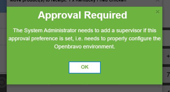| Description | When approval is required but there are not supervisors defined, a message is shown: "Approval Required The System Administrator needs to add a supervisor if this approval preference is set, i.e. needs to properly configure the Openbravo environment." The message is not good enough considering the audience. The cashier attempting to execute the action will find more useful a simpler message "Appoval Required. There are not supervisors defined, please contact your System Administrator" | |||||||||||