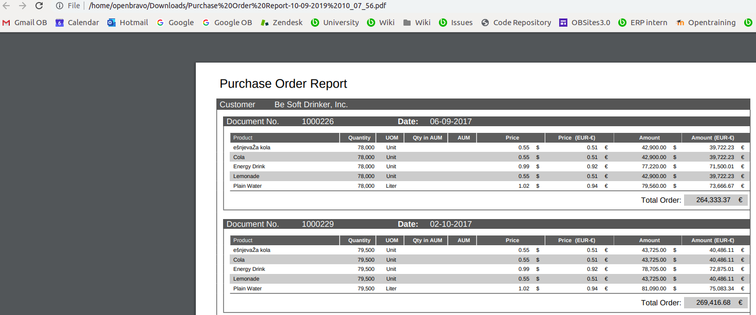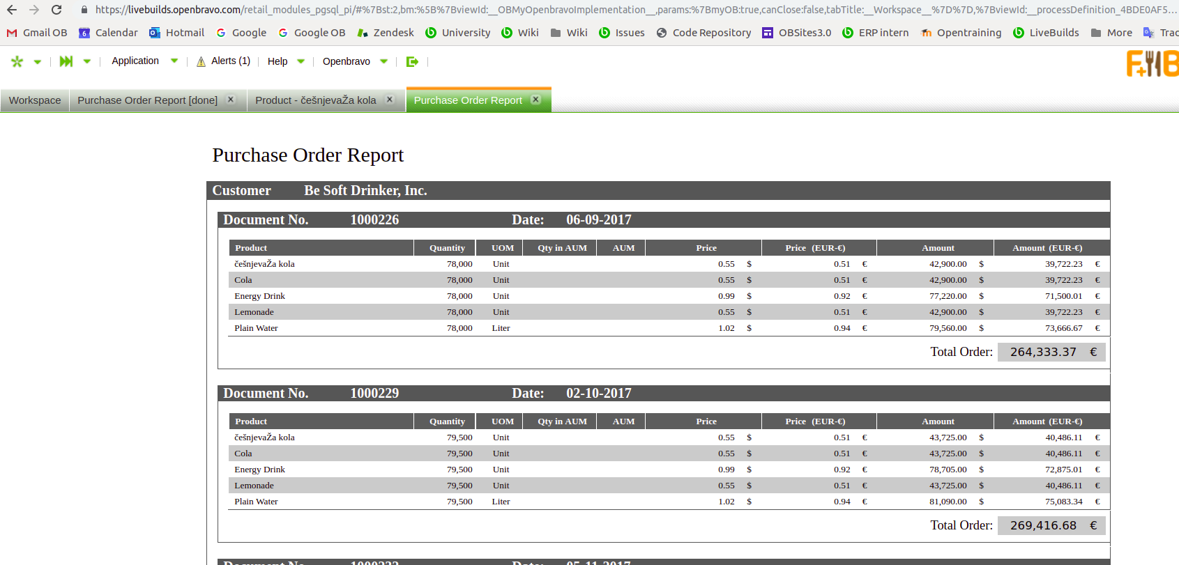 | Steps To Reproduce | *go to Openbravo Livebuilds and enter to the Retail with Modules back office *change product name “Cherry Cola” for “češnjevaŽa kola” (from window Product) *go to window Purchase Order Report, select the following: Organization = F&B US West Coast, Business Partner = Be Soft Drinker, Inc., Currency = EUR, Starting Date = 01-09-2017, Ending Date = 10-09-2019 (the rest of fields blank). Click button “Export to PDF”, in the PDF the č doesn’t appear (image 1). You can click on button “View” and see it appearing in the report (image 2). Note: if the product “cherry cola” (“češnjevaŽa kola”) doesn’t appear do some transactions to make it appear or change the dates of the report in order to make it appear | |||||||