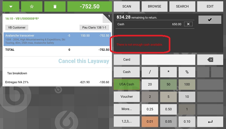 | Steps To Reproduce | 0. Just to ensure the environment is clean, perform a Cashup in the terminal not keeping any cash. 1. Log in VB-1 terminal and create a receipt for 5 Avalanche Transceivers 2. Pick the menu option "Layaway this receipt" 3. Add 400€ and click "Layaway" button 4. Open the receipt and add $100 and click "Layaway" button 5. Open the receipt and click the "Cancel this layaway" menu option 6. The total amount is shown, but only in Euros. 7. Change the amount in Euros to 400. 8. Move to "USA Cash", notice the message "There is not enough cash available" even the terminal has literally just received the amount of cash required to perform the operation. | ||||||||||