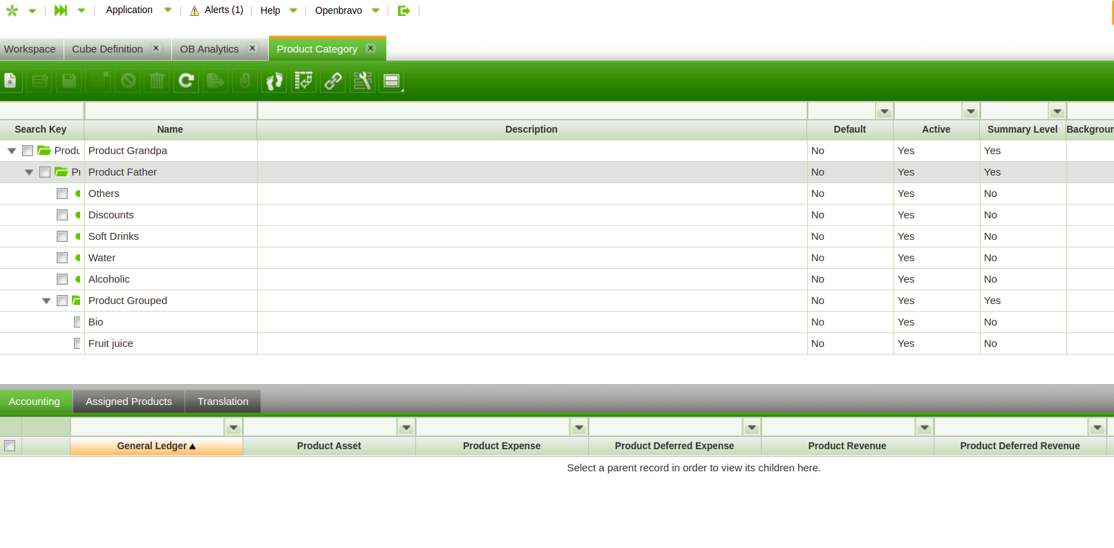 | Description | Having product categories grouped into some hierarchy levels and some of them at the last level and others at the one before, OB Analytics only shows the last level product categories (two images provided of the hierarchy and the analytics result) | |||||||