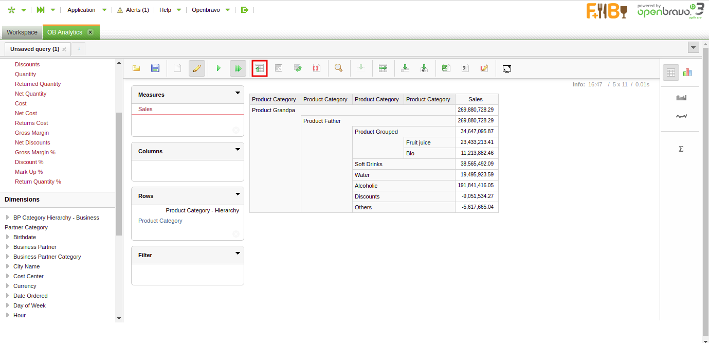 | Steps To Reproduce | *go to Openbravo livebuilds section Retail with Modules link pgsql backend *change role to System Administrator, go to Cube Definition window. Select Sales Details Fact Cube, go to its tab Cube Dimensions. Search row with productCategory as Model Element, change the field of Ignore Tree Hierarchy to not selected for that row *change role to F&B International Group Admin. Go to Product Category window. Create a hierarchy like in the attached image (Img 01 - Product Category Hierarchy.png). To make this create a new record with: Organization = *, Search Key = Product Grandpa, Name = Product Grandpa, Summary Level = selected, Seq. No = 01. Create a new record with: Organization = *, Search Key = Product Father, Name = Product Father, Summary Level = selected, Seq. No = 03. create a new record with: Organization = *, Search Key = Product Grouped, Name = Product Grouped, Summary Level = selected, Seq. No = 05. Then click on button Toggle Tree Grid Visibility, to see the hierarchy, move the products to the folders in order to have the hierarchy as seen in the image. Product Grandpa is the root, which contains Product Father, … *Go to Process Request window, create a new process: Client = F&B International Group, Organization = *, Process = Forward Update Analytics Fact Tables, Timing = Run Immediately (the rest the default values). Then click on button Schedule Process. Wait until it’s on Success Status (on tab Process Monitor, you should refresh the window to see it) *go to OB Analytics windows, select cube Sales Details Fact Cube. Add Sales on Measures (drag it from the left Measures menu to the one on the right), add Product Category on Rows (the Product Category which is inside Product Category > Product Category Hierarchy > Product Category). Then you can see the result as in the attached image (Img 02 .- Hierarchy not fully shown.png). | |||||||