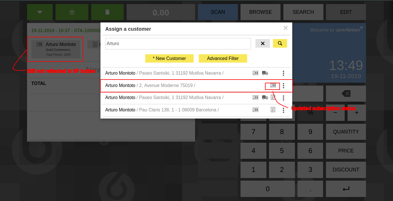 | Description | A newly added loyalty subscription is not immediately reflected on the subscription icon of the Customer button for the ticket. Searching said customer in the "Assign a customer" popup does refresh said tag, however. | |||||||||||
