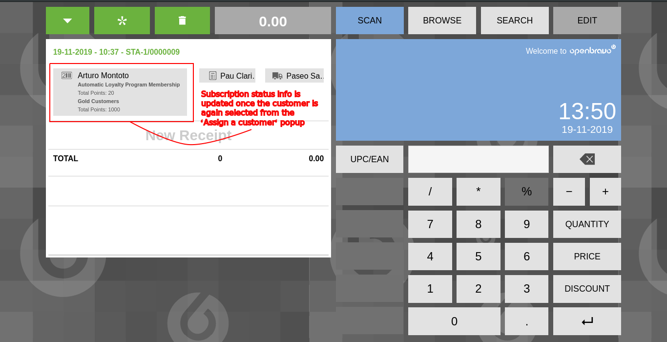 | Steps To Reproduce | PRECONDITION: "Loyalty Programs" and "Loyalty Programs for Web POS" modules must be installed. -- In the ERP: perform basic setup for Loyalty Programs (as shown in the OB Wiki page: http://wiki.openbravo.com/wiki/Projects:Loyalty_Programs/User_Guide#Who_can_subscribe_clients.3F [^]) 0. Log in the ERP and change the role to "The White Valley Group Admin" 1. Go to "Channel - Touchpoint Type" an open a record in form (p.e. VBS POS Terminal Type) 2. In the "Loyalty" section, check the "Enable Loyalty Features" box, and check the newly shown "Can Subscribe to Loyalty Programs" box 3. Go to the "Document Sequence" window, and create a new record for the "The White Valley Group" organization 4. Go to "Loyalty Program" window and create a new record and subtab records with the previously created document sequence set in the "Member Identifier Sequence" field -- In the POS 0. Log in a terminal belonging to the loyalty program enabled terminal type; in this case, VBS-1 1. Click on the contextual button (three vertical dots) on a customer which isn't the anonymous one, and click on the "View Details" option 2. In the "Customer details" window try to add a "Loyalty Card" by clicking in the orange "plus" shaped button at the bottom 3. Click on the "New Subscription" button and follow the indications in the prompted popups to create a new subscription 4. Save the newly added subscription, and close all of the popups back to the "Assign a customer" popup NOTICE that the subscription icon hasn't updated to reflect the newly added subscription (check the "subscription-status-icon.png" screenshot) 5. Filter the current customer, and click on the lens button to search NOTICE that the customer now shows the updated subscription status icon (showing 1 if no subscriptions were set, and 2 or more if 1 or more were added before it, check the "updated-bp-subscription-status.png" screenshot) | |||||||||||