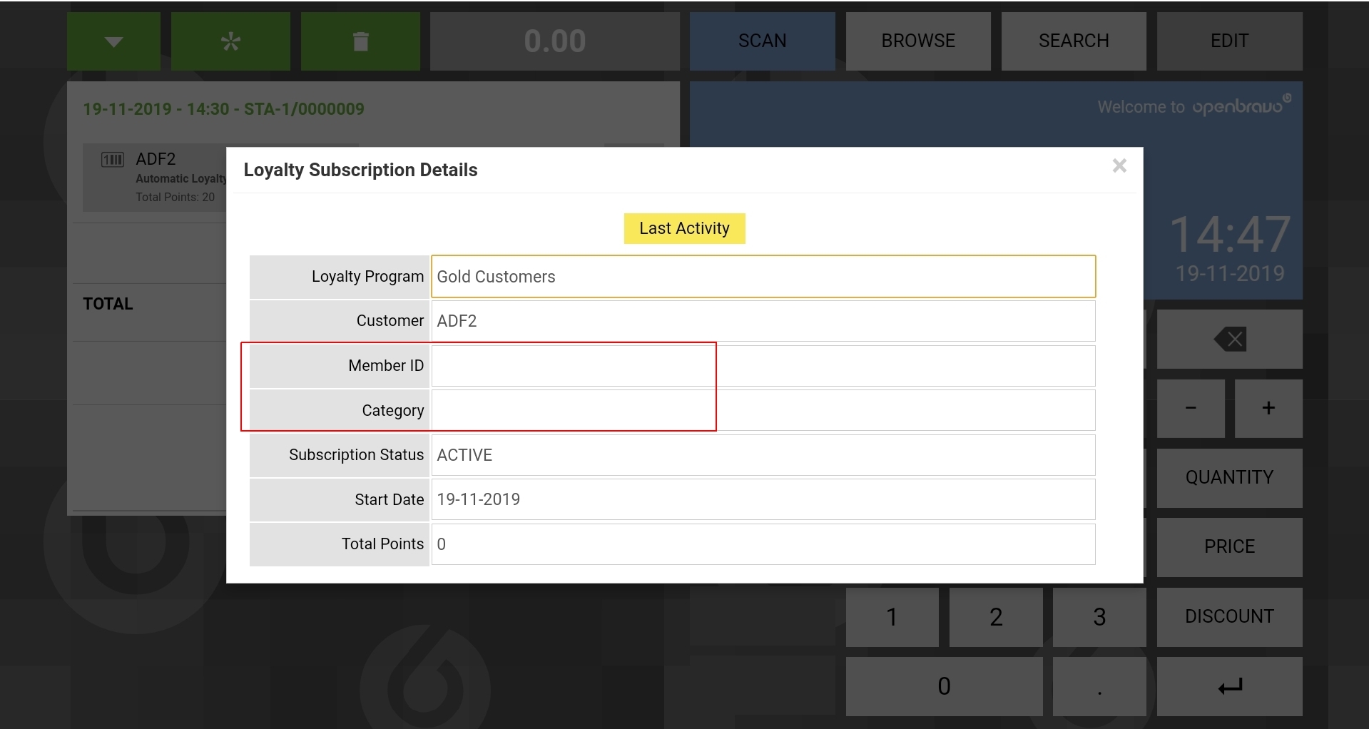 | Steps To Reproduce | PRECONDITION: "Loyalty Programs" and "Loyalty Programs for Web POS" modules must be installed. -- In the ERP: perform basic setup for Loyalty Programs (as shown in the OB Wiki page: http://wiki.openbravo.com/wiki/Projects:Loyalty_Programs/User_Guide#Who_can_subscribe_clients.3F [^]) 0. Log in the ERP and change the role to "The White Valley Group Admin" 1. Go to "Channel - Touchpoint Type" an open a record in form (p.e. VBS POS Terminal Type) 2. In the "Loyalty" section, check the "Enable Loyalty Features" box, and check the newly shown "Can Subscribe to Loyalty Programs" box 3. Go to the "Document Sequence" window, and create a new record for the "The White Valley Group" organization 4. Go to "Loyalty Program" window and create a new record and subtab records with the previously created document sequence set in the "Member Identifier Sequence" field -- In the POS 0. Log in a terminal belonging to the loyalty program enabled terminal type; in this case, VBS-1 1. Create a new customer by using the "* New Customer" button in the "Assign a customer" popup. 2. Go into Offline mode by disconnecting/disabling the active network connection of the device in use, and by navigating to the profile details of the dropdown menu if needed. 3. Click on the contextual button (three vertical dots) on the previously created customer, and click on the "View Details" option. 4. In the "Customer details" window try to add a "Loyalty Card" by clicking in the orange "plus" shaped button at the bottom 5. Click on the "New Subscription" button and follow the indications in the prompted popups to create a new subscription 6. Save the newly added subscription, and close all of the popups back to the "Assign a customer" popup 7. Go back into Online mode by reconecting 8. Repeat steps 3 and 4, to show the subscriptions 9. In the "View <new customer> Loyalty Subsctiption(s)" popup, check that the record with the subscription and it's details from the "View details" contextual menu option show as in the attached screenshots NOTICE that the subscription is correctly synced to the backend in the "Subscriptions" subtab of the previously created "Loyalty Program", with properly generated Member ID value, and its corresponding subscription Category field. But neither are shown in the POS, unless an incremental or masterdata refresh is performed. | |||||||||||
