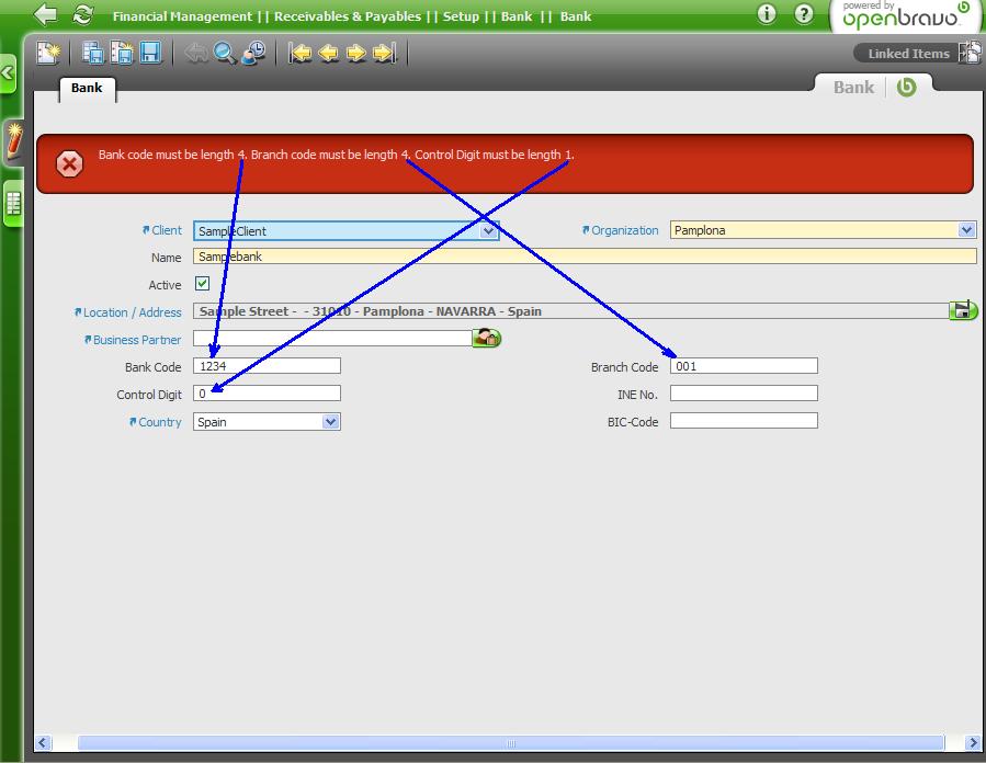 | Steps To Reproduce | 1. Go Financial Management || Receivables & Payables || Setup || Bank 2. Create a new Bank. Fill mandatory data (Name, Address) 3. Fill Bank Code with 1234 4. Fill Branch code with 001 5. Fill Control Digit with 0 6. Save. An error message is displayed about Bank Code, Branch Code and Control Digit, but only Branch Code has erroneous data (see attach) | ||||||||||