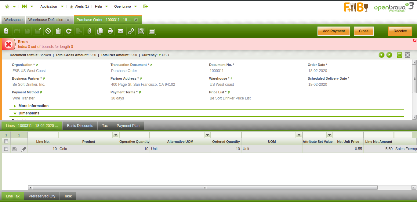 | Steps To Reproduce | PRECONDITION: the "Advanced Warehouse Operations Pack" module pack, and optionally, the "Advanced Warehouse Operations Sampledata" modules must be installed. Set up an OB instance locally, and manually configure the "US West Coast" Warehouse under the "F&B US West Coast" Organization, to enable it for the use of AWO and by making the least required configurations (Internal Routing Areas, Storage Bin Group, Storage Bin, Routing, Routing Assignment, Warehouse Algorithm Assignment) for its Warehouse Definition. To do so, follow the link to this guide: https://docs.google.com/document/d/1vSezZWgU2XUHeIsV-KDm7k-yBBqy0U_Mw_7S5KWwZ3A/edit?usp=sharing [^] This guide is located in the folder with additional AWO training resources: https://drive.google.com/drive/folders/1wYS_OcSfL4ymBmw-lXarhPaP4VBwHfRI?usp=sharing [^] Once this is done, execute the following steps: 0. Log in as user "Openbravo" with "F&B International Admin Group" Role 1. Select the "US West Coast" Organization in the Warehouse Definition window, and navigate to the Warehouse Algorithm Assignment subtab 2. Open the "Receipt Purchase Order" record in form view, and select "PA Default Product Storage Bin" in the Warehouse Algorithm field and save it 3. Create a new Purchase Order for "F&B US West Coast" Organization and "US West Coast" Warehouse with one line for any product, and Book it 4. Click on the Receive process action button followed by done NOTICE that an error status bar appears with the "Index 0 out-of-bounds for length 0" message; check the attached screenshot that depicts this. | |||||||||||