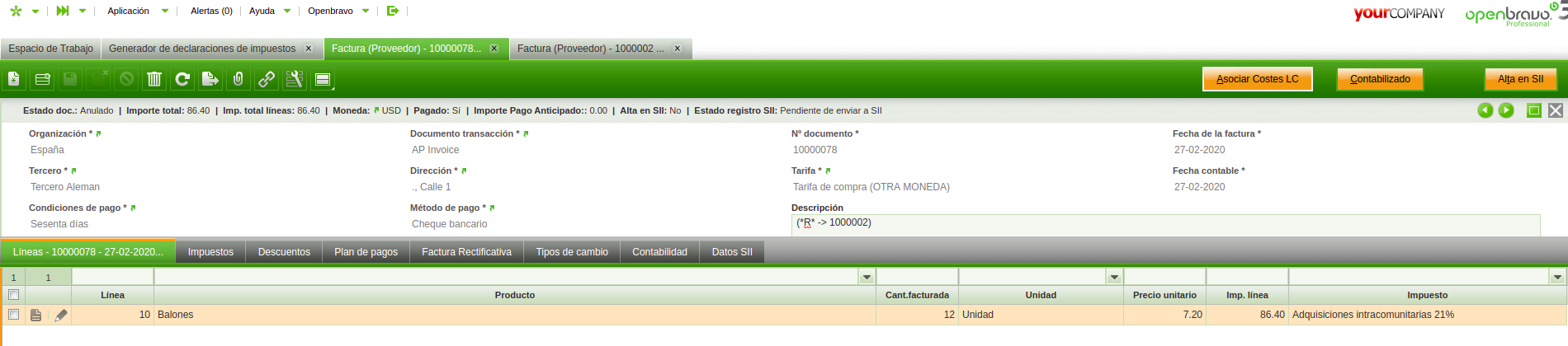 Plan de test (Español): - Ingrese como Administrador del Grupo - Crear una nueva factura de compra/venta con alguno de los siguientes impuestos: · Inversión Sujeto Pasivo UE 7% (-7%) - IVA Reducido Servicios (Compra) · Adquisiciones intracomunitarias 21% (-21%) ISP - IVA Normal ISP (Compra) · Inversión Sujeto Pasivo UE 18% (+18%) - IVA Normal Servicios (Compra) · Inversión Sujeto Pasivo UE 16% (-16%) - IVA Normal Servicios (Compra) · Adquisiciones intracomunitarias 7% (+7%) - IVA Reducido (Compra) · Inversión Sujeto Pasivo UE 10% (-10%) - IVA Reducido Servicios (Compra) · Inversión Sujeto Pasivo UE 16% (+16%) - IVA Normal Servicios (Compra) · Adquisiciones intracomunitarias 21% (+21%) ISP - IVA Normal ISP (Compra) · Adquisiciones intracomunitarias 18% (+18%) - IVA Normal (Compra) · Adquisiciones intracomunitarias 16% (+16%) - IVA Normal (Compra) · Adquisiciones intracomunitarias 8% - IVA Reducido (Compra) · Adquisiciones intracomunitarias 4% (-4%) - IVA Super Reducido (Compra) · Inversión Sujeto Pasivo UE 7% (+7%) - IVA Reducido Servicios (Compra) · Adquisiciones intracomunitarias 21% - IVA Normal (Compra) · Inversión Sujeto Pasivo UE 10% (+10%) - IVA Reducido Servicios (Compra) · Adquisiciones intracomunitarias 16% (-16%) - IVA Normal (Compra) · Adquisiciones intracomunitarias 10% (+10%) - IVA Reducido (Compra) · Adquisiciones intracomunitarias 21% (-21%) - IVA Normal (Compra) · Inversión Sujeto Pasivo UE 21% (-21%) - IVA Normal Servicios (Compra) · Adquisiciones intracomunitarias 16% - IVA Normal (Compra) · Adquisiciones intracomunitarias Bienes Inversión 21% (+21%) - IVA Normal Bienes Inversión (Compra) · Adquisiciones intracomunitarias Bienes Inversión 18% (-18%) - IVA Normal Bienes Inversión (Compra) · Adquisiciones intracomunitarias 10% (-10%) - IVA Reducido (Compra) · Inversión Sujeto Pasivo UE 8% (-8%) - IVA Reducido Servicios (Compra) · Adquisiciones intracomunitarias 18% (-18%) - IVA Normal (Compra) · Adquisiciones intracomunitarias Bienes Inversión 18% (+18%) - IVA Normal Bienes Inversión (Compra) · Adquisiciones intracomunitarias 4% (+4%) - IVA Super Reducido (Compra) · Adquisiciones intracomunitarias 8% (+8%) - IVA Reducido (Compra) · Adquisiciones intracomunitarias 4% - IVA Super Reducido (Compra) · Adquisiciones intracomunitarias 21% (+21%) - IVA Normal (Compra) · Adquisiciones intracomunitarias 18% - IVA Normal (Compra) · Inversión Sujeto Pasivo UE 8% (+8%) - IVA Reducido Servicios (Compra) · Inversión Sujeto Pasivo UE 21% (+21%) - IVA Normal Servicios (Compra) · Adquisiciones intracomunitarias 8% (-8%) - IVA Reducido (Compra) · Adquisiciones intracomunitarias exentas - Exento (Compra) · Adquisiciones intracomunitarias 7% - IVA Reducido (Compra) · Inversión Sujeto Pasivo UE 18% (-18%) - IVA Normal Servicios (Compra) · Adquisiciones intracomunitarias 10% - IVA Reducido (Compra) · Adquisiciones intracomunitarias 7% (-7%) - IVA Reducido (Compra) · Adquisiciones intracomunitarias Bienes Inversión 21% (-21%) - IVA Normal Bienes Inversión (Compra) · Servicios prestados UE (%N=>0%) - IVA Normal Servicios (Venta) · Servicios prestados UE (%R=>0%) - IVA Reducido Servicios (Venta) · Entregas intracomunitarias Bienes Inversión (%N=>0%) - IVA Normal Bienes Inversión (Venta) · Entregas intracomunitarias (%R=>0%) - IVA Reducido (Venta) · Entregas intracomunitarias (%N=>0%) ISP - IVA Normal ISP (Venta) · Entregas intracomunitarias (%SR=>0%) - IVA Super Reducido (Venta) · Entregas intracomunitarias (%N=>0%) - IVA Normal (Venta) - Rellenar el resto de datos, completar y contabilizar. - Anular esta factura e ir a su correspondiente anulada, solapa "Factura Rectificativa", rellenar los campos según corresponda y contabilizar la factura. - Correr el modelo 349 y verificar que los datos son correctos. |