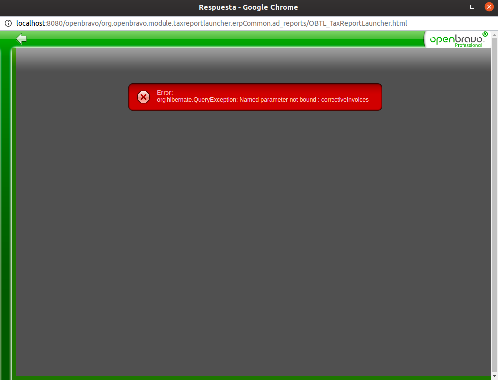 | Proposed Solution | --- AEAT3492010ReportDao.java.ori 2020-01-19 20:28:38.000000000 +0100 +++ AEAT3492010ReportDao.java 2020-02-18 12:47:43.785406000 +0100 @@ -946,9 +946,9 @@ //@formatter:on final Query<Object[]> query2 = session.createQuery(sql2, Object[].class); query2.setParameter("taxReportId", taxReport.getId()); - query2.setParameter("taxRates", correctiveInvoices); + query2.setParameter("correctiveInvoices", correctiveInvoices); query2.setParameter("taxRates", taxRates); - + invoicesNotInEUR.addAll(query2.list()); List<Map<String, Object>> bpAmounts_new = new ArrayList<Map<String, Object>>(); | |||||||