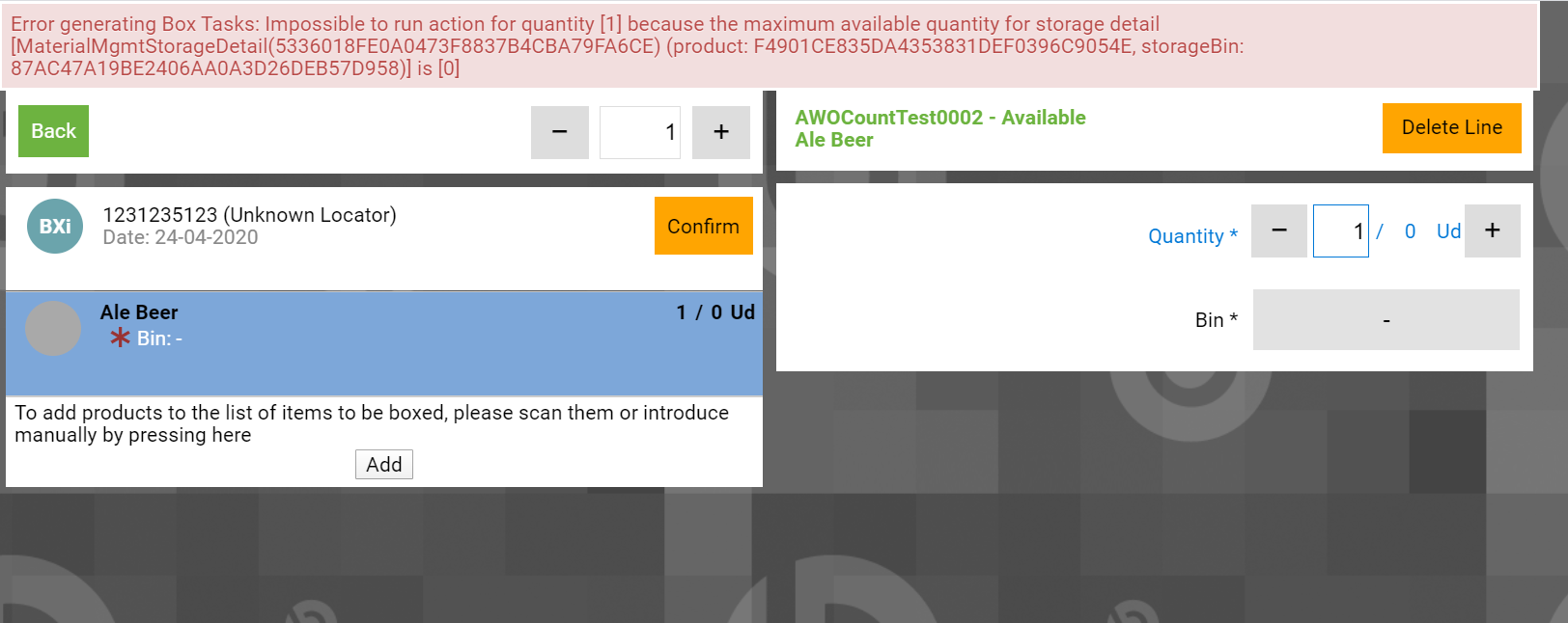| Steps To Reproduce | 0-Login in AWO context. 1-Click dropdown menu and click Box option. 2-Click Create new reference and select Big box option and fill Reference input field with "333". Then click Create & Box button. 3-Click add buton, type "ale" and click magnifier button. Select an Ale record marked as "Task in process" (check attached image). 4-Once it has been added, click "Confirm" button and release the message shown is not descriptive for a final user. | |||||||||||