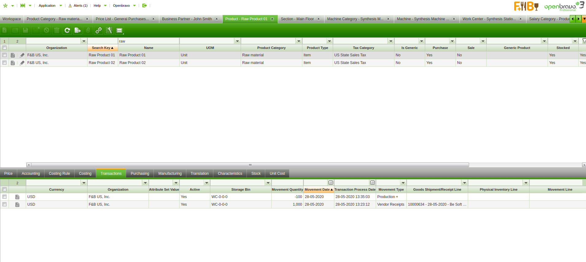 * Go to Product window, select Raw Product 01. Go to tab Transactions, the Movement Type of the last transaction is Production + when it should be Production – because this product is the one that has been consumed