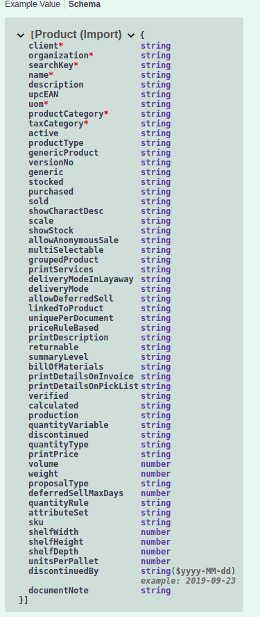 | Steps To Reproduce | 1) Go to https://livebuilds.openbravo.com/retail_modules_pgsql_pi/api [^] 2) Choose any endpoint for example the Product import 3) Expand the schema, note that all the fields are detailed here but there is no description explaining the purpose/meaning of each field (see attached screenshot). | |||||||