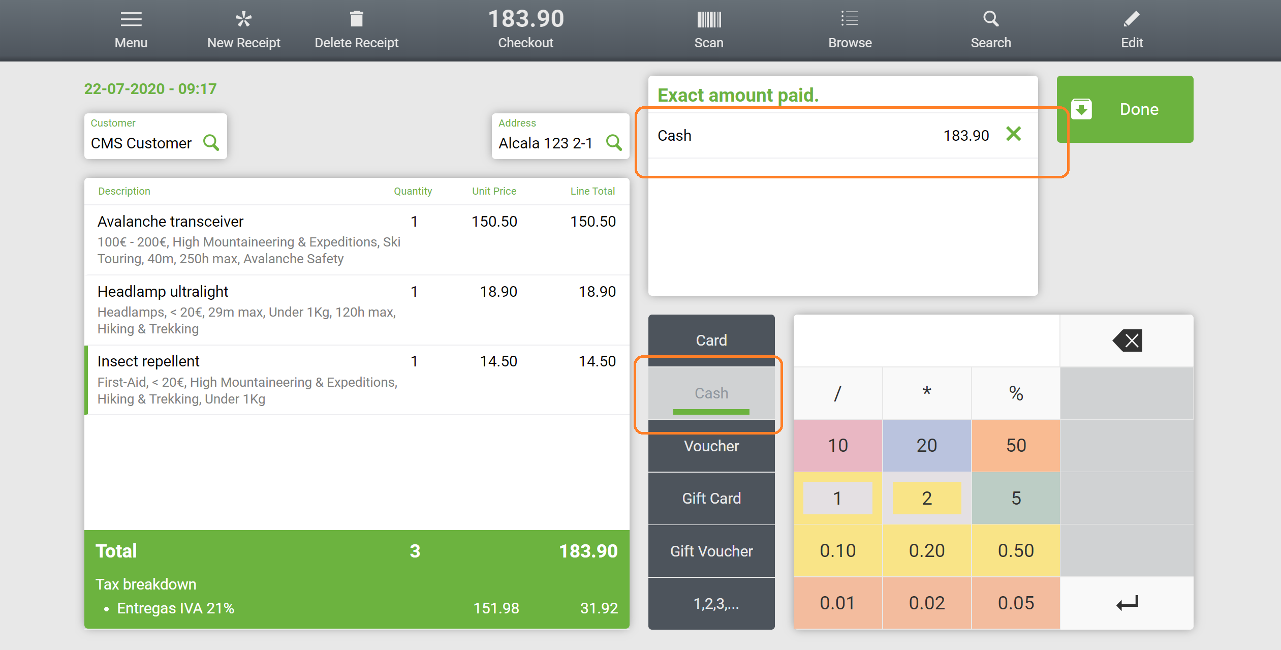 4-Click Done button to pay the ticket. DEFECT: Realise Cash Payment Method appears as disabled and it must be disabled, but it is selectable through Checkout button and the receipt can be completed this way using Cash. (It is possible this situation appears since Cash is the default Payment Method WHEN Safe Box is chosen)