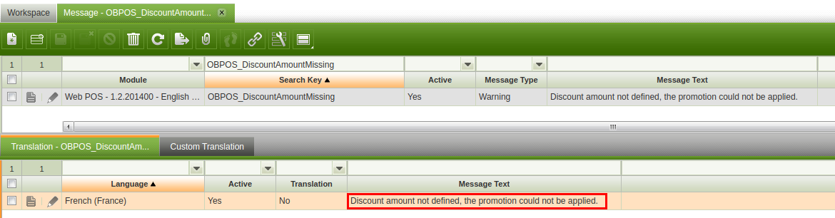 | Steps To Reproduce | BACKOFFICE: *login as System administrator *Check message OBPOS_DiscountAmountMissing, french translation is available but not translated | ||||||||||