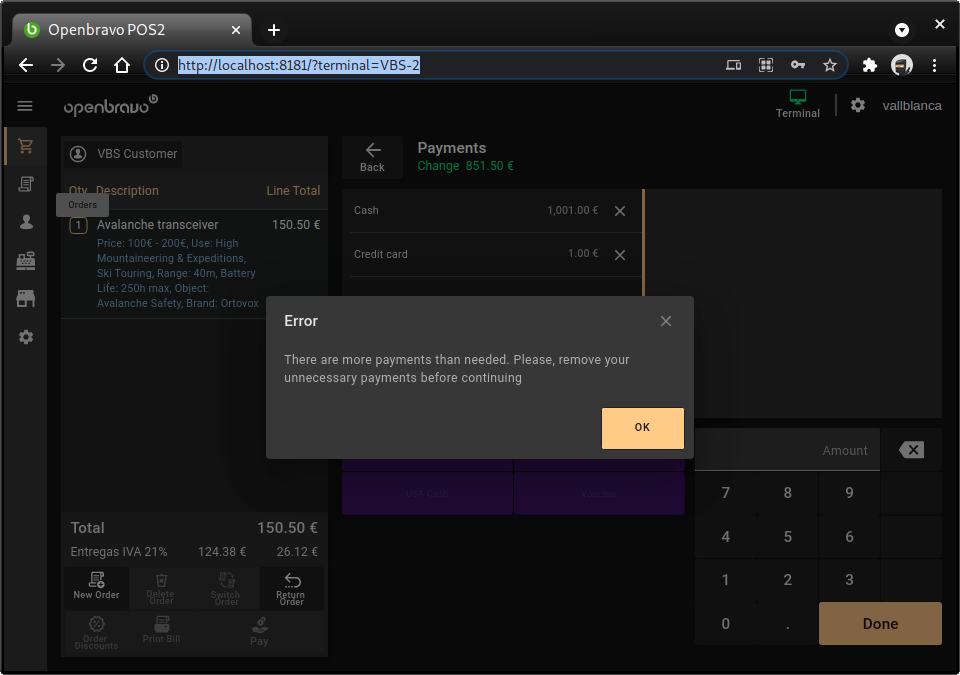 | Steps To Reproduce | In a receipt of 200€ total. * Add a cash payment of 1€ * Add a card payment of 1€ * Add a cash payment of 1000€ * Press DONE Verify the check extra payments error is displayed but actually it should be accepted as the extra cash amount is change In a receipt of 200€ total. * Add a card payment of 1€ * Add a cash payment of 1€ * Add a card payment of 1000€ * Press DONE Verify the check extra payments error is displayed but actually it should be managed as an overpayment that will depend to be accepted on the card payment method configuration. See screenshots. | |||||||||||