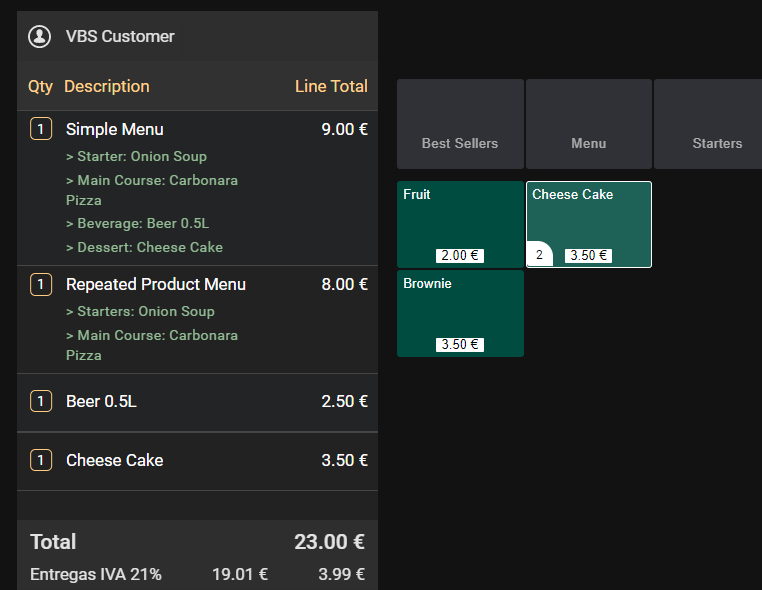 | Steps To Reproduce | 1. Add to a blank ticket "onion soup", "beer", "cheese cake" and "carbonara pizza" as individual products (the adding order is important) 2. Notice a "Simple menu" is discovered so the total of the ticket is now 9€ 3. Add now the same products but in different order: "onion soup", "carbonara pizza", "beer" and "cheese cake" 4. Notice a "Repeated Product Menu" is discovered for the first two products but the beer and the dessert are kept as individual products. The total of the ticket is now 23€ when it could be 18€ if the products in step 3 were added as a second "simple menu" | ||||||||||