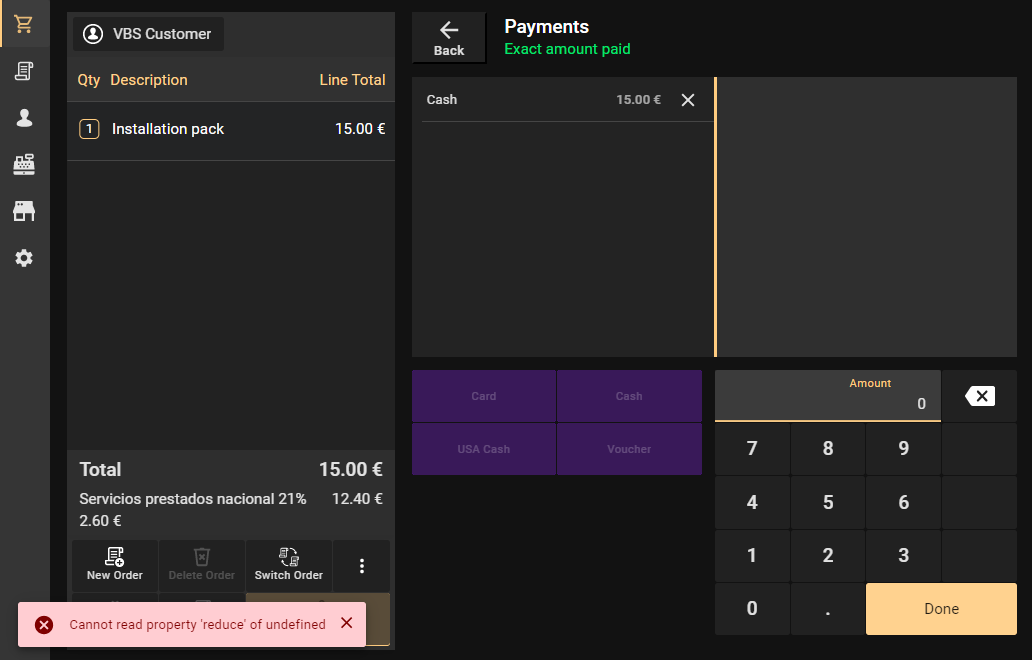 | Steps To Reproduce | 1. Add the product "Installation pack", located at "Trekking & Camping" category 2. Pay the ticket with the total amount in Cash 3. An error is shown "Cannot read property 'reduce' of undefined" as shown in the attached screenshot | ||||||||||