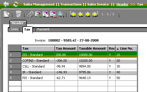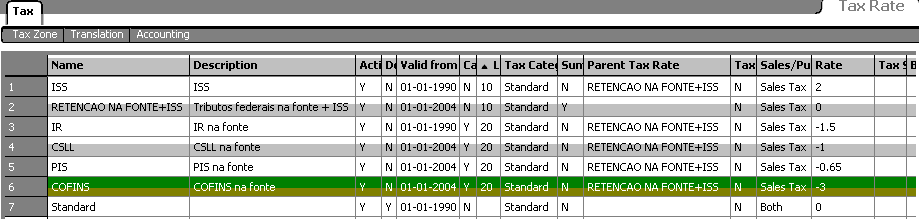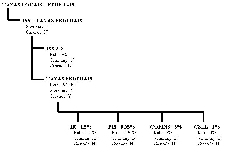 | Description | If I insert more than 1 tax with cascade checked. It´s not work , it´s act like a normal calculation. I´m need to make tax calculation to Brasil : What I´m want to do : Service : R$ 10000,00 TAX Taxable amount + ISS 2% : R$ 200,00 R$ 10000,00 -IR 1,5% : R$ 153,00 R$ 10200,00 -Cofins 3% : R$ 306,00 R$ 10200,00 -PIS 0,65 %: R$ 66,30 R$ 10200,00 -CSLL 1% : R$ 102,00 R$ 10200,00 Value for deposit by client: R$ 9572,70 | ||||||||||