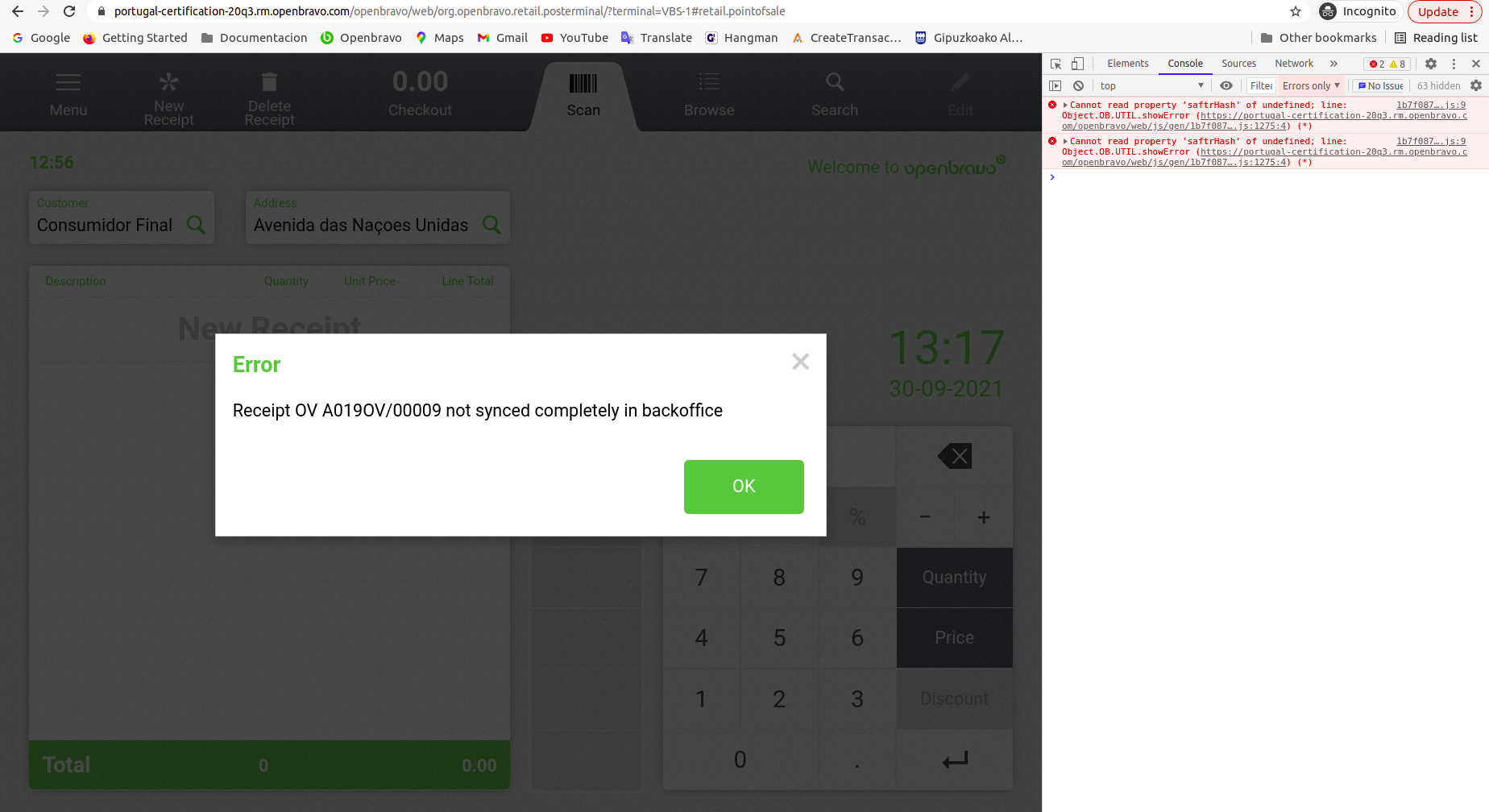 | Steps To Reproduce | In an environment with PT certification code in 20Q3, run HM. Create a sale, complete it (by pressing "Checkout") and pay it. From the menu, select the option "Open Receipt". Select the receipt/sale just created. See image "Open Receipt" Click on "Checkout" option, and then Done, the error shown in the image attached is shown. See the image Error_cannotreadproperty. From the menu, select once more the option "Open Receipt" and once more the receipt/sale just created. Another error is shown. See image "Error_notSyced" | |||||||||||