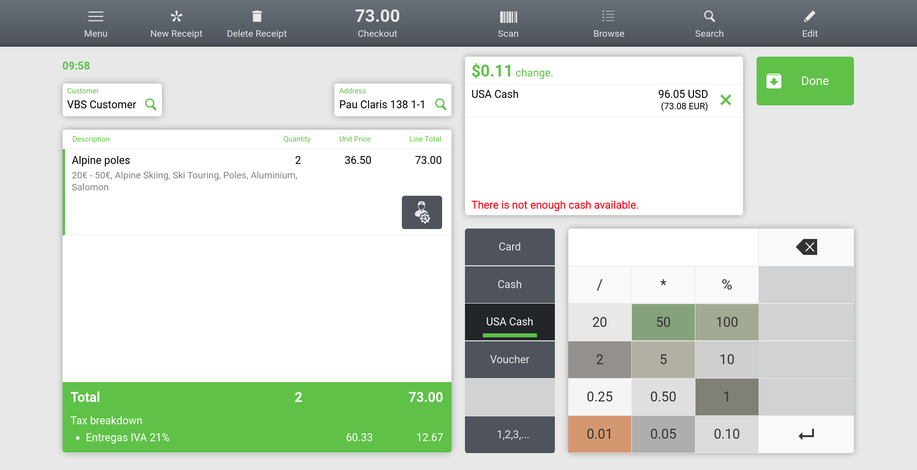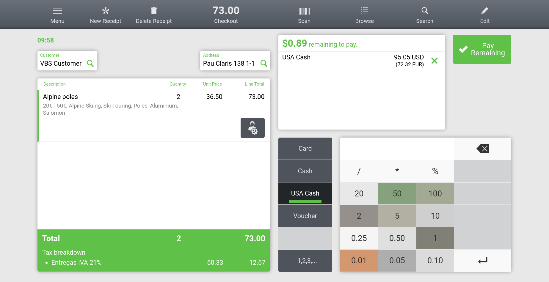 | Steps To Reproduce | 1. Log in Web POS (vallblanca). 2. Add 2 Alpine Poles to the ticket. 3. Go to checkout. 4. Click on the USA Cash button. 5. Pay by clicking the following sequence of quantities: 50$, 20$, 20$, 5$, 0.05$. You could see that the "remaining to pay" amount is wrongly updated. 6. Pay by clicking on 1$ and you could see the "change" amount is also wrong. | |||||||||||
