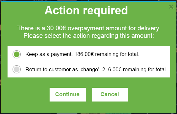 7) The popup to handle prepayment cash overpayment (modalDeliveryChange enyo component) is shown with this information