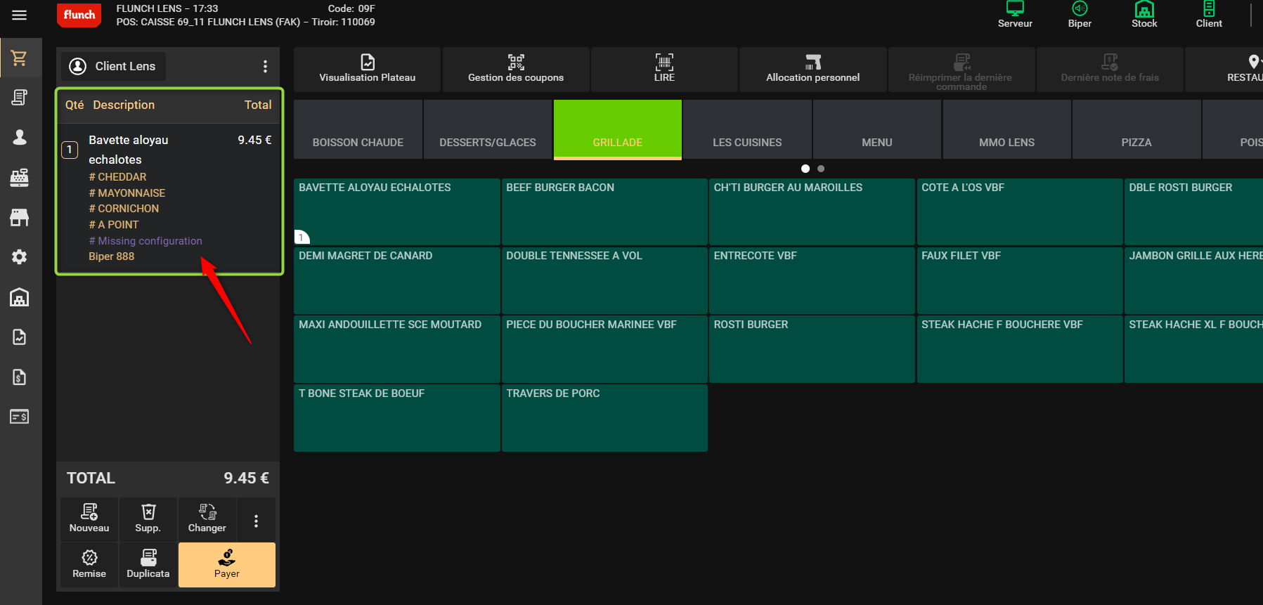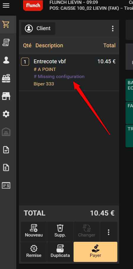 Here we need to chose a product with a modifier (exemple : Entrecote) finish his configuration and see that there is the message (Missing configuration) as in the picture