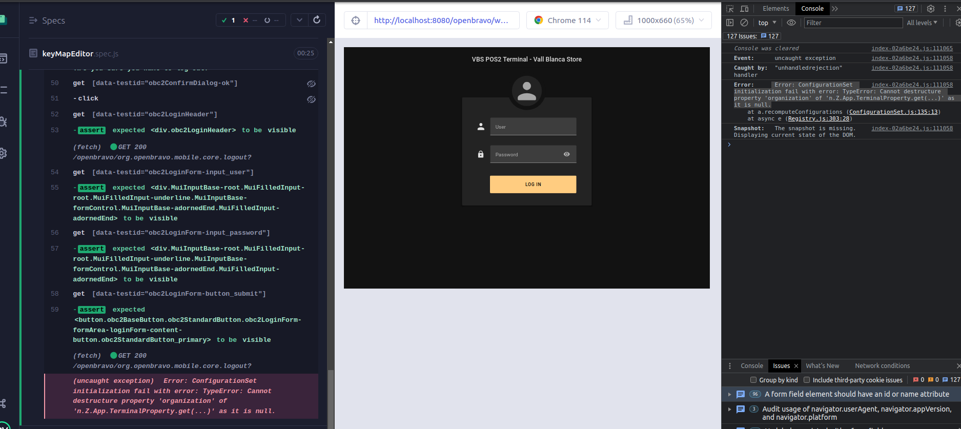 Also, now preconditions has changed as Cypress version has been updated ,like the POS version. Now instead a full screen unhandled error, the following message is displayed in the console: