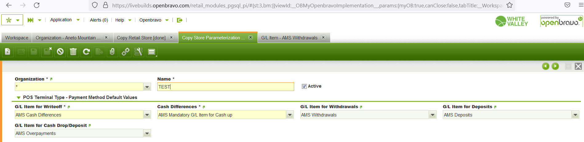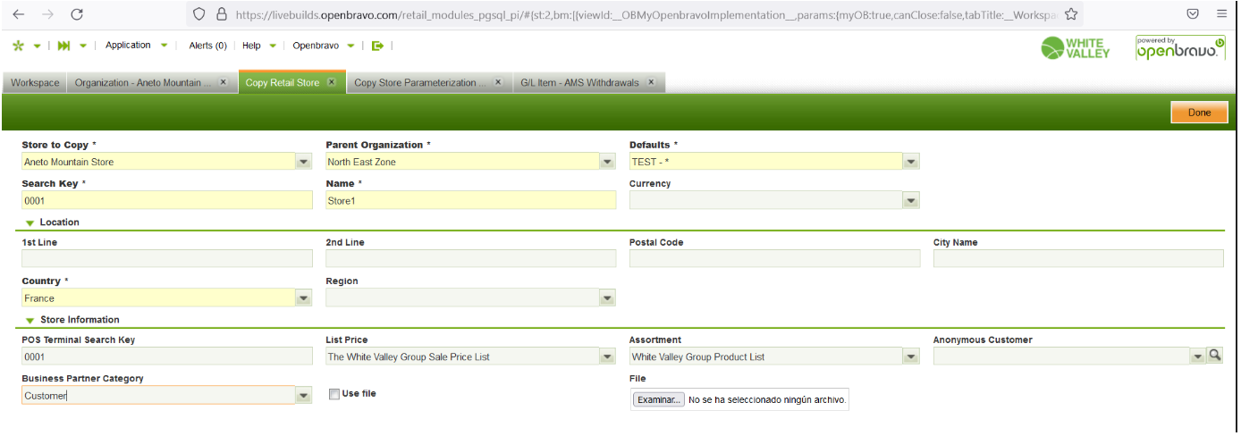 | Steps To Reproduce | *Log into BE https://livebuilds.openbravo.com/retail_modules_pgsql_pi/ [^] *Define Copy Store Parameterization, see image1 *Execute the process Copy Retail Store, see image2 *Check that the new Store1 has been created with Advanced Warehouse Operations Flow=No although it is Yes for the original store. | |||||||||||