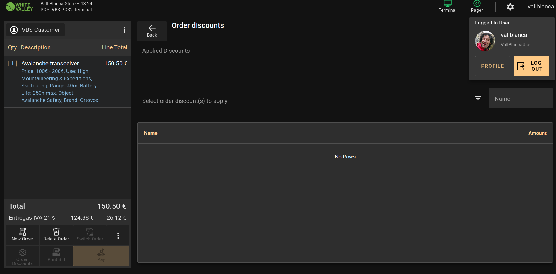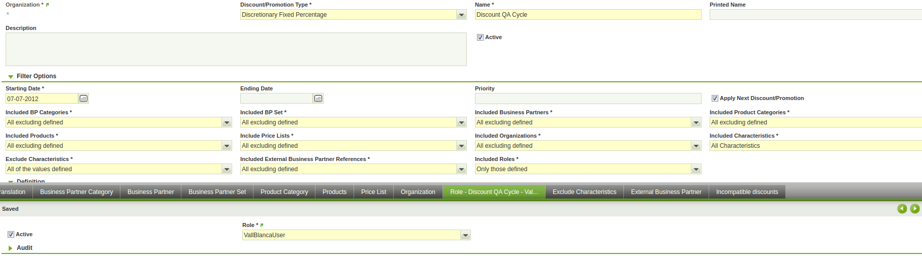 | Steps To Reproduce | Preconditions: -Log in ERP as Group -Admin-The White Valley Group -Go to Discounts and Promotions window -Create new record -Header tab -Discount type: Discretionary Fixed Percentage -Name: Discount 5% -Starting Date: 01-01-2012 -Percentage Discount: 5.00 -Role tab: Select VallBlancaUser Steps to reproduce: - Log in POS - Change to the Role: VallBlancaUser - Create a new order and add a line - Select Discounts No discounts are observed to apply. | |||||||||||
