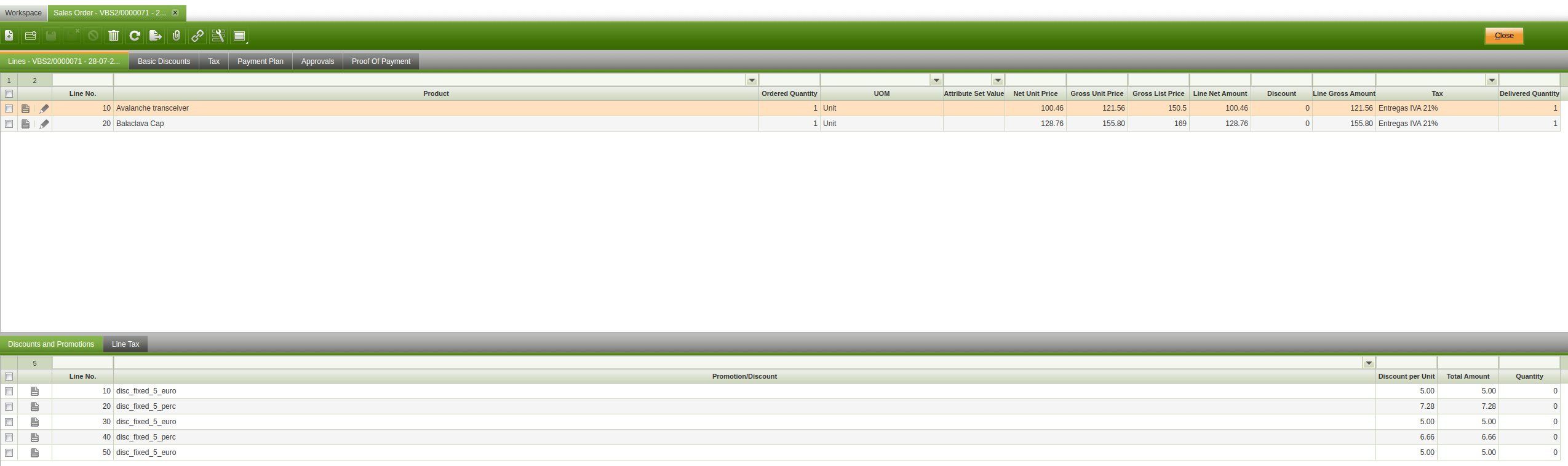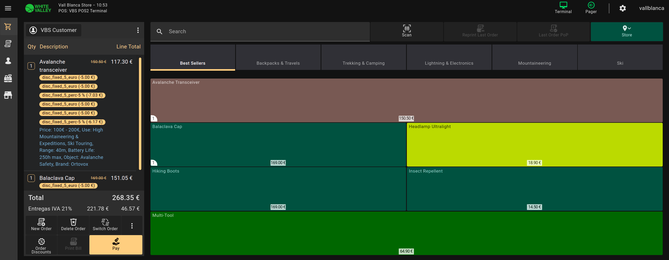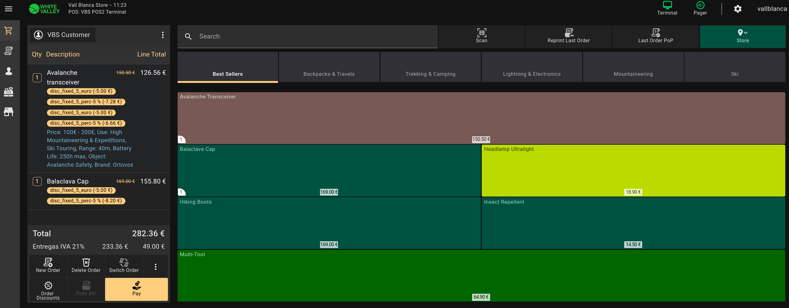 | Steps To Reproduce | 0-Login POS2 as vallblanca. 1-Add 1x "Avalanche transceiver" and 1x "Balaclava Cap" to the receipt. 2-Click in the first added line and, in the overlay, click "Discount" button. 3-Click both checkboxes to add discounts to both lines and add both available discounts ("disc_fixed_5_euro" & "disc_fixed_5_perc"). Click Apply button. 4-Click in the first added line and, in the overlay, click "Discount" button. 5-With only the first line checkbox selected, add "disc_fixed_5_euro" discount and click Apply. DEFECT: Discounts are multiplied (and this can be multiplied several times executing the same process again and again). | |||||||