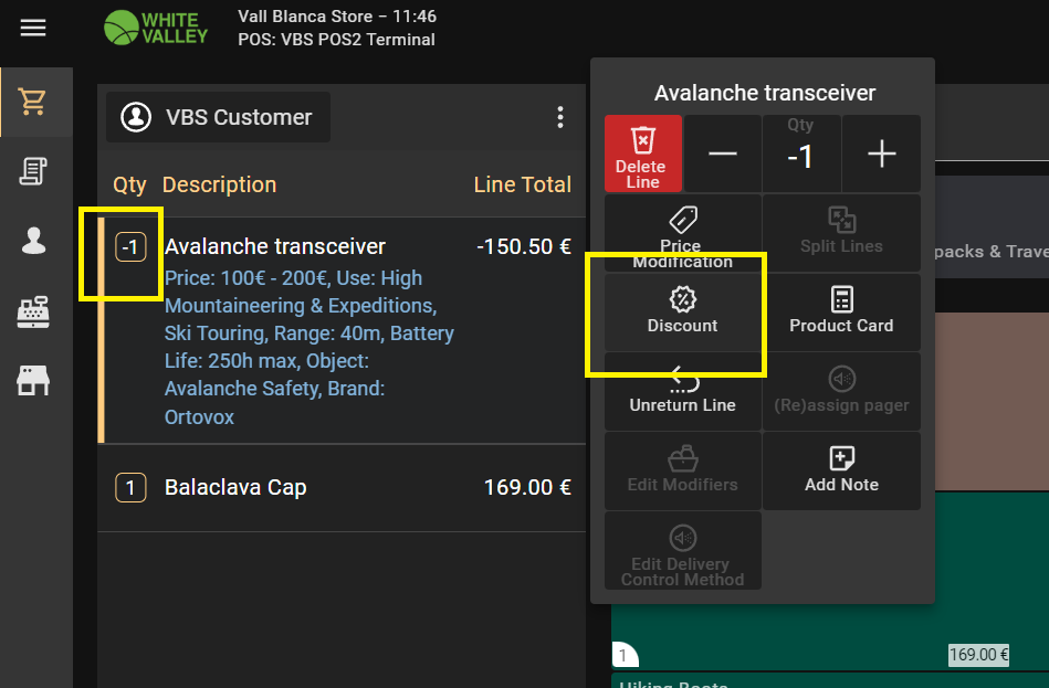 | Steps To Reproduce | 0-Login POS2 as vallblanca. 1-Add 1x "Avalanche transceiver" to the current ticket. 2-Click in the product line and click "Retun line" button. DEFECT: "Discount" button is still enabled. 3-Click outside the overlay to close it and click again in the product line that now is marked to be returned. DEFECT: "Discount" button is also enabled but no discounts can be applied to that line since it is to be returned. | |||||||||||