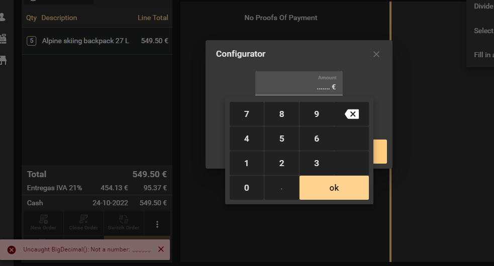 | Steps To Reproduce | 1. Open a recently paid receipt and go to Proof of Payment option 2. Go to Create New and then to "Fill in amount" 3. Click the amount field to open the keypad 4. In the keypad, type five decimal dots 5. Click ok. Notice the uncaught exception in the background as shown in the attached screenshot | |||||||||||