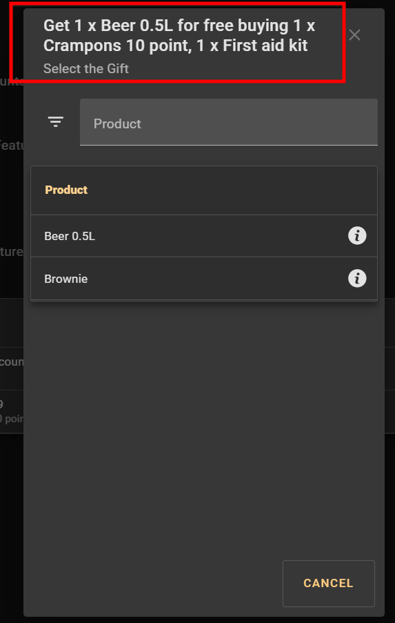 | Description | For promotion type Buy X Get Y as gift, the message that appears in the gift pop up changes depending on the promotion configuration. For subtype All X Any Y, it is not clear and has to be changed ggi: Example: Change: "Get 1 x Beer 0.5L for free buying 1 x Crampons 10 point, 1 x First aid kit" (buy all x get any y) To: "Get 1 products for free buying 1 products" (buy any x get any y) Important needed to check first with product management it will a customization for the client or a change in the standard for everyone | |||||||||||