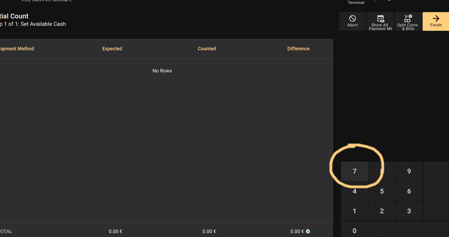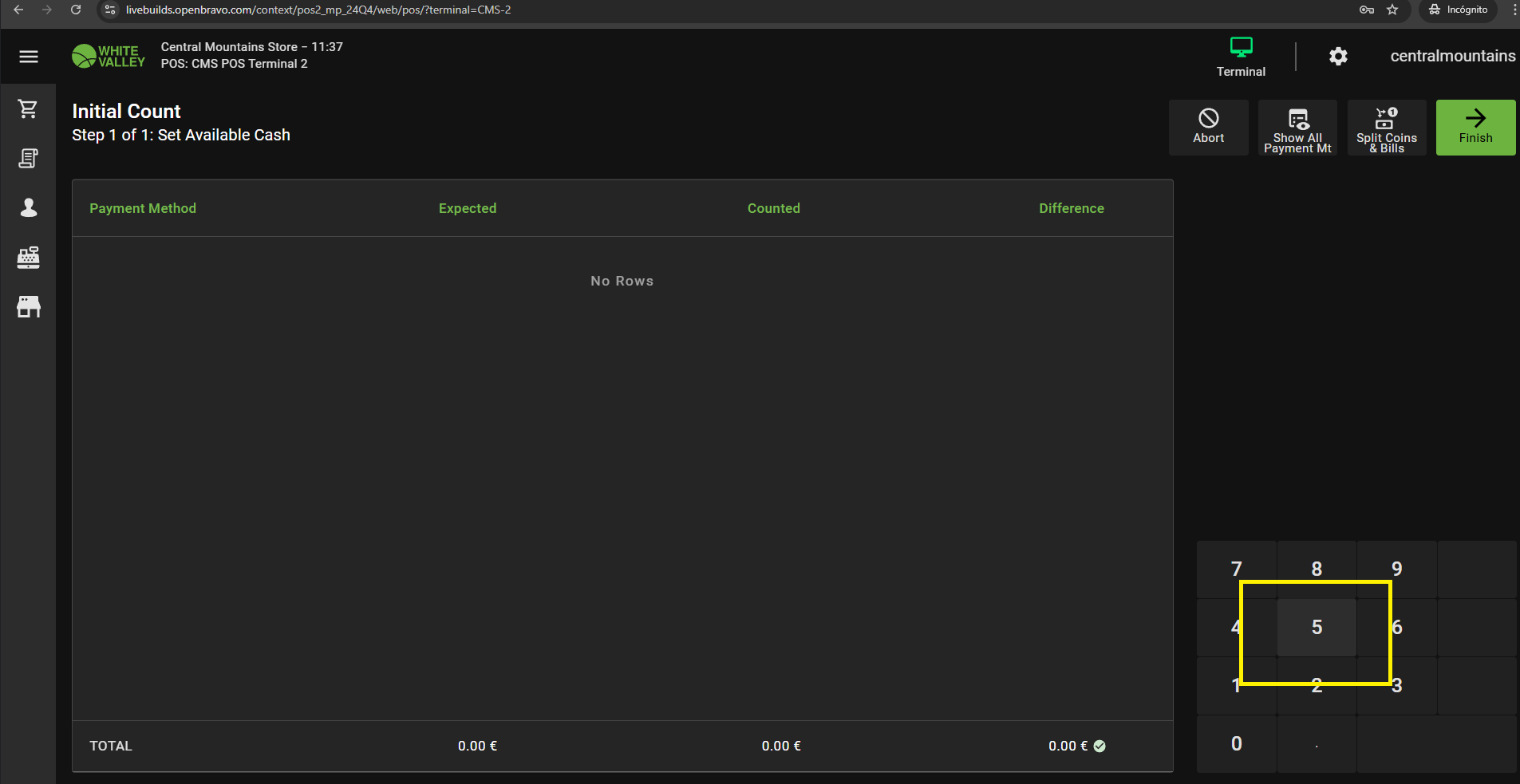 | Steps To Reproduce | 0-Login POS as centralmountains using CMS-2 terminal. 1-Initial Count process will be initiated and "Step 1 of 1: Set Available Cash" will be shown. There, click any keypad button at the bottom right of the POS screen and realise it stays pressed. In case it is not reproducible following this last step, do the following: Execute the click (mousedown event) inside any keypad button, such as "5" button, and finish the mouseup event outside that button (outside the container where the click was started). | |||||||||||