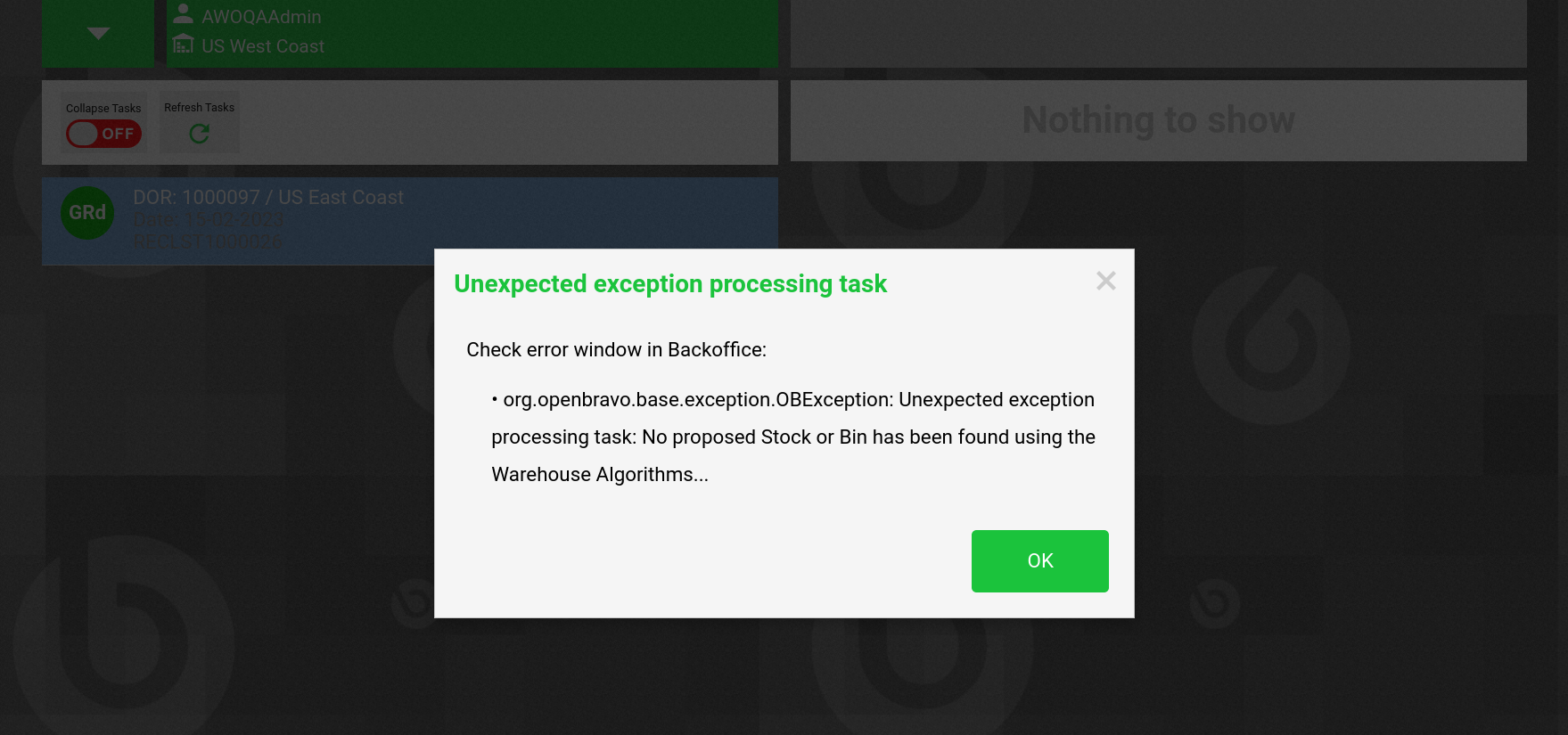 | Steps To Reproduce | 0-Using AWO sampledata, login Backoffice as AWOQAAdmin. 1-Go to Sales Order window. 2-Create a new record and fill it with the following data: --- Organization: US Business Partner: Healthy Food Supermarkets, Co. Warehouse: US West Coast --- Save the record. 3-Go to Lines tab and create a new record with the following data: --- Product: Apple Operative Quantity: 30 --- Save the record and book it. 4-Click Issue process and choose to assigne it to AWOQAAdmin. Click Done. Process will be successfully executed. 5-Now, login AWO frontend as AWOQAAdmin. 6-Go to profile and be sure the following configuration is set (otherwise, set it as follows): --- Role: AWO-QA Admin - AWO-QA Organization: * Warehouse: US West Coast --- 7-Watch the task previosly created with that Sales Order and click on it. 8-Now, click in Quantity input field to set the focus there. 9-Set in that input field "000000" and quickly press Confirm button. DEFECT: In case that process has been done fast enough, the application will show an error (check attached image). | |||||||||||