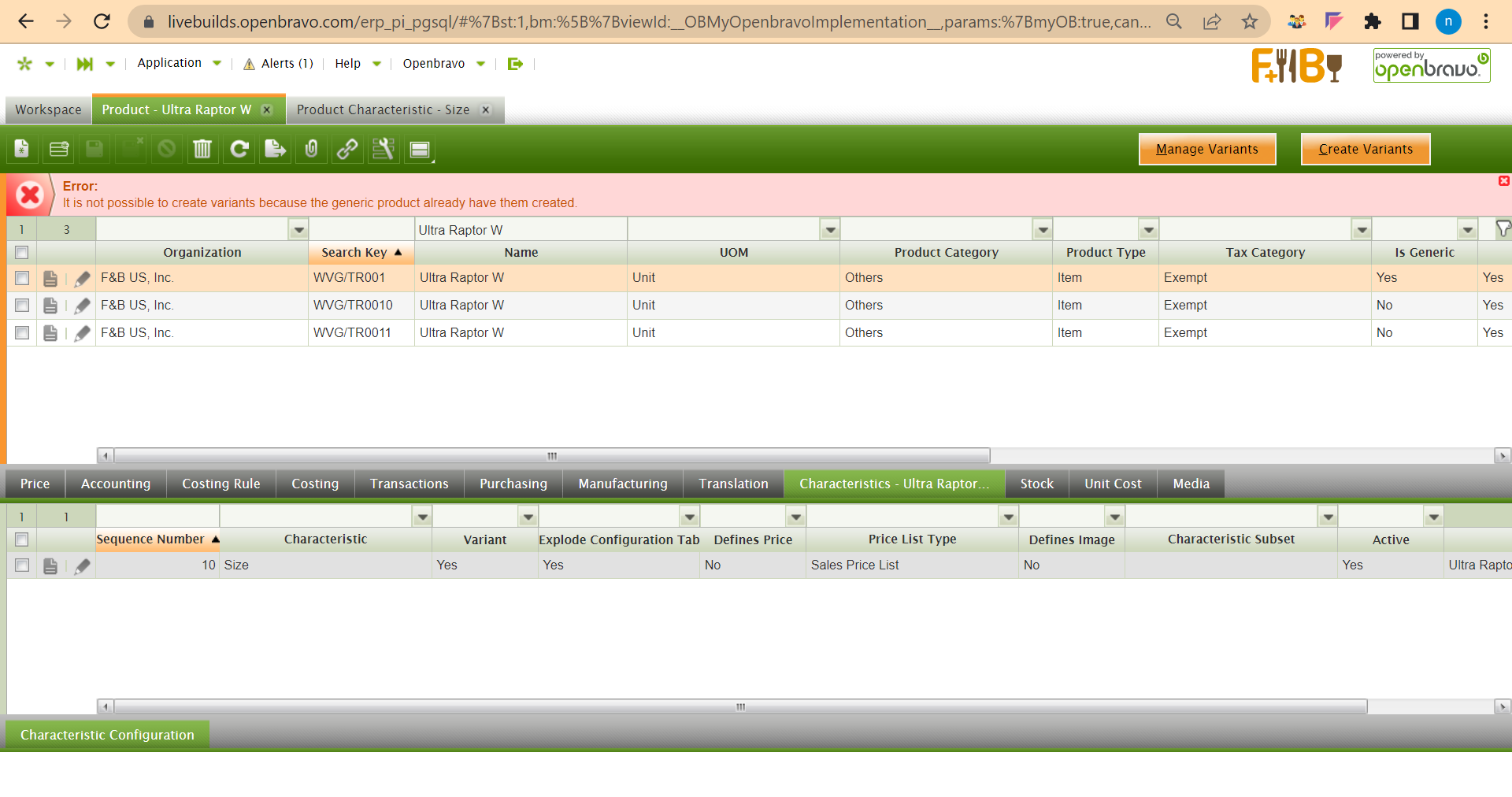 | Description | Getting errors "It is not possible to create variants because the generic product already have them created." while creating a variant on create a variant button on the product page. | |||||||||||