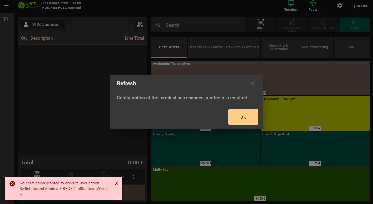 | Description | The login of a user with a misconfigured role generates an error message that is not correct. Case A: The role is missing the "SwitchToMainWindow" user action ==> The message says that the action missing is "SwitchCurrentWindow_OBPOS2_MainWindow" Case B: The role is missing the "SwitchToInitialCountWindow" user action ==> The message says that the action missing is "SwitchCurrentWindow_OBPOS2_InitialCountWindo" Case C: The role is missing the "Validate Cashup and advance to next step", "Finish Initial Count" or "Standard Initial Count" ==> There is no error but the application fails to start | |||||||||||