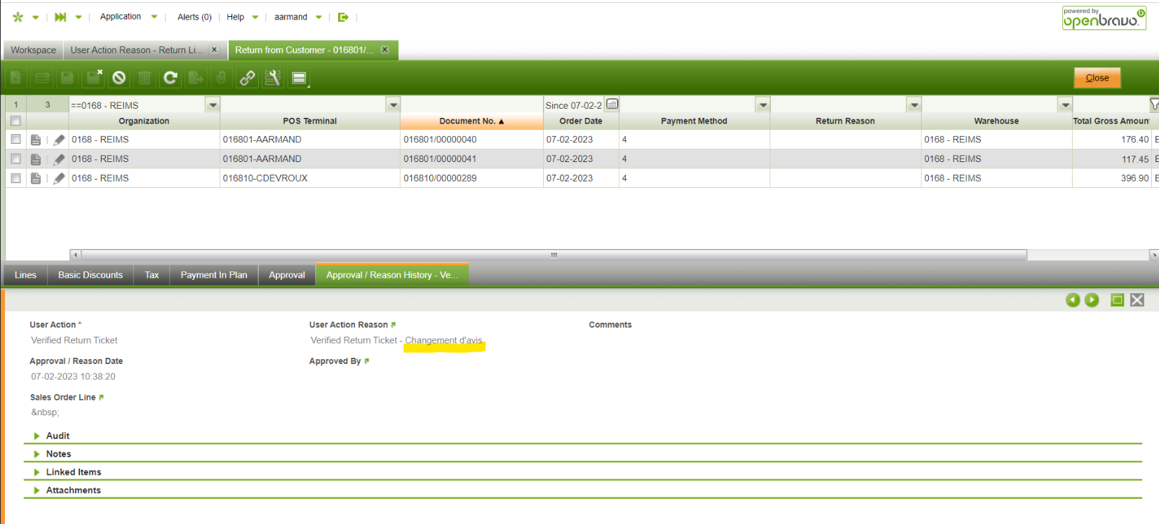 | Summary | 0053078: [SALES] [VERIFIED RETURN/RETURN LINES] : In BO, display only the reasons of return in the field "User action reason" | |||||||||||