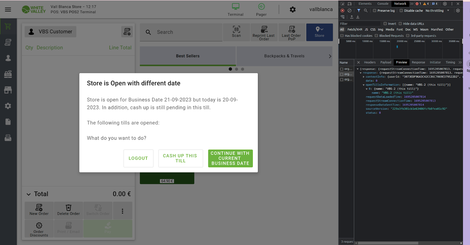 | Steps To Reproduce | 0) Log into POS2 If the Initial Count does not appear, follow these steps 1) Close Till 2) Log into backoffice 3) Change the role to The White Valley Group Admin 4) Go to Terminals and Tills Status window 5) Search for VBS-2 by Search Key and select the record 6) Click on the 'Close Tills' button at the upper right side 7) Go to POS2, refresh and log in again If the Initial Count appears or you executed the previous steps, now continue with these ones 1) In the 1st step of the Initial Count process, select the date of tomorrow 2) Click Next 3) In the 2nd step, click Finish 4) Open developer tools (Ctrl+shift+I) and go to Network tab 5) In POS, click any product to add it to the ticket 6) Click on Pay 7) Select any payment method, such as Cash 8) Click on Done => The message will not show any till as opened (incorrect) 9) In developer tools, search for this request, click on it and select Response: org.openbravo.retail.sessions.CountOpenTills$timeout=15000 => the current till will appear as opened (correct) | |||||||||||