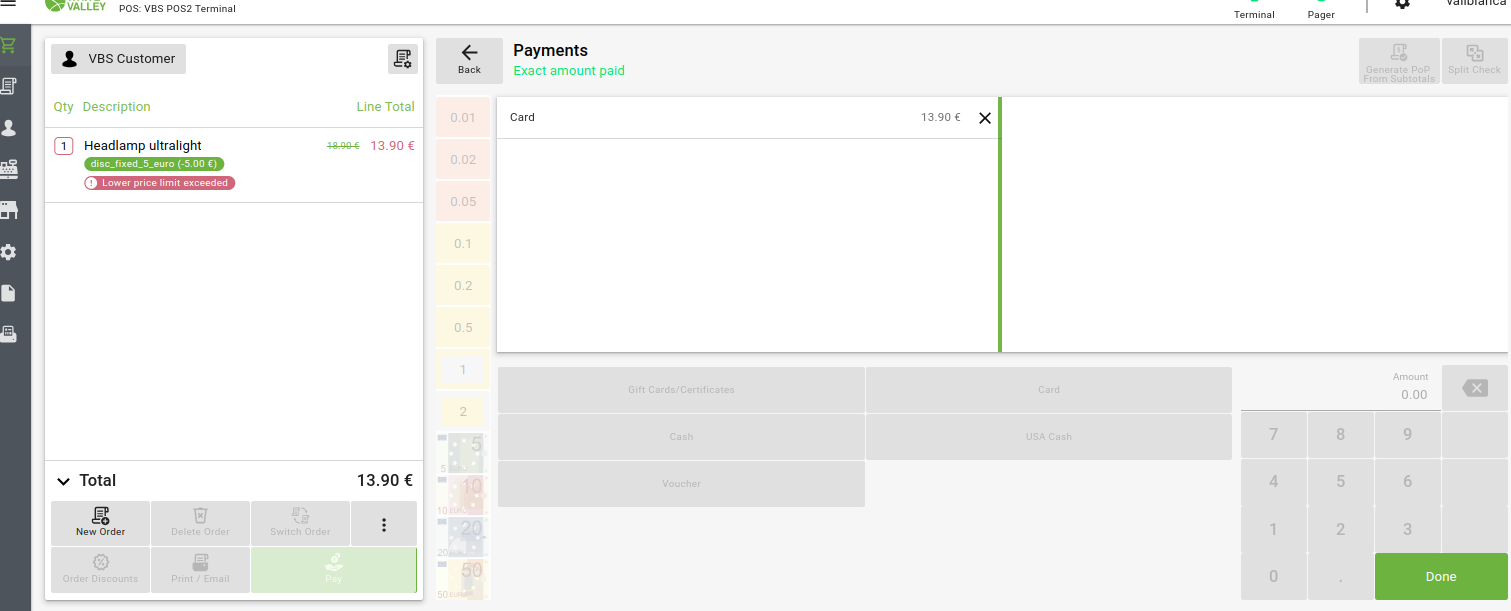 | Steps To Reproduce | ERP Configuration - Login ERP with user: Openbravo /pass: openbravo - Change "User Role" to: "The White Valley Group Admin - The White Valley Group" - Go to "Preference" Window and create new record with the following: - Active: Checked - Property List: Checked - Property: Web POS Enable Loss Sales - Value: Y - Visibility: All fields should be empty except "Visible at Client": "The White Valley Group" - Go to "Product" window and select "Headlamp ultralight" - Go to "Price" Tab & Edit "The White Valley Group Sale Price List Version" - Lower Limit Price: 15 - Save the changes. - Go to "Role" window - Select "VallBlancaUser" Role - Go to "User Action Access" tab - Add a new record: - User Action: Validate Prices - Confirmation Required: checked - Approval: "Can Use" - Reason Request Type: "Defined Action Reasons (Optional)" - Active: checked Steps to reproduce issue: - Login POS - Add "Headlamp Ultralight" to the ticket - Click ticket Line and select "Discount" - Apply "disc_fixed_5_euro" - Discount should be applied and a red label should appear "Lower price limit exceeded" - Click "Pay" & Price Limit pop up will be displayed - Click "Validate", a confirmation required pop up will be displayed - Click "Cancel" - NOK behavior, ticket can be paid even without a Validation for the lower limit price exceeded | |||||||||||