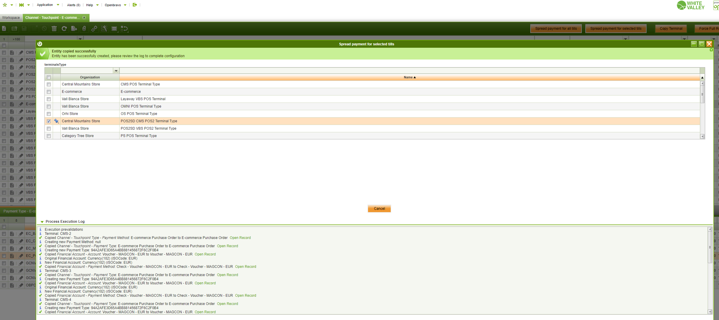| Steps To Reproduce | 0-Login Openbravo Backoffice inside a context with Copy Retail Store module installed. 1-Go to Channel - Touchpoint window, select E-commerce record and go to Payment Type tab. 2-Select EC_PuchaseOrder record and, at the top right of the screen, click "Spread payment for selected tills" process. 3-Inside the "Spread payment for selected tills" popup, select "POS2SD CMS POS2 Terminal Type" record and click Done button. DEFECT: Realise "Creating new Payment Method: null" appears in the Process Execution Log (check attached image) | |||||||||||
