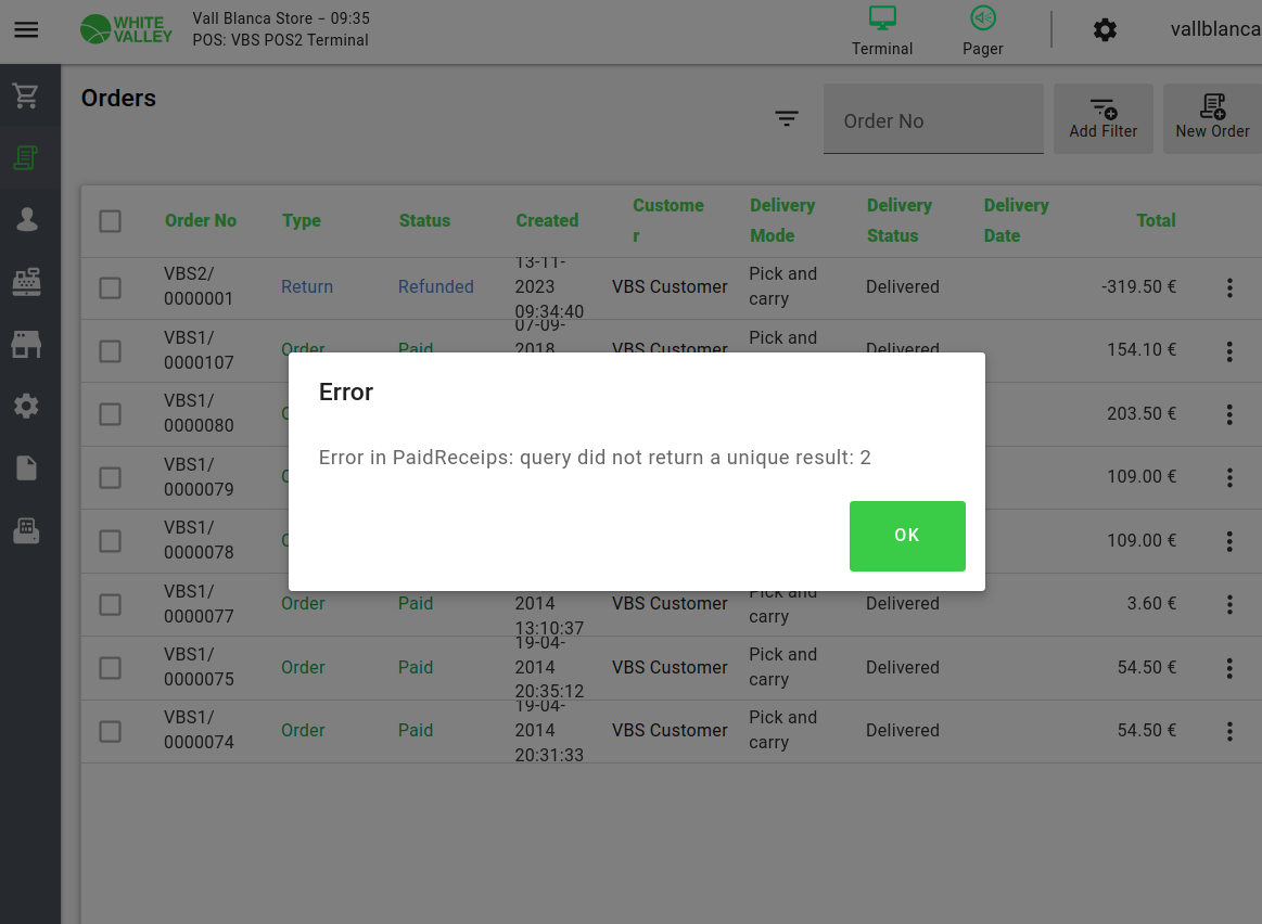| Description | When we create a ticket with two returned lines, and then opening it in the Orders window. An error showed "ERROR in PaidReceipts: query did not return a unique result:2". | |||||||